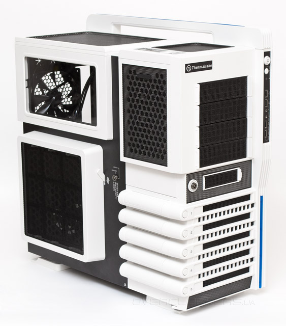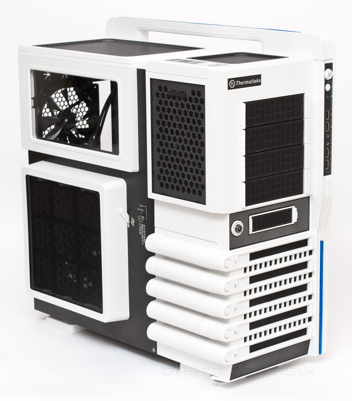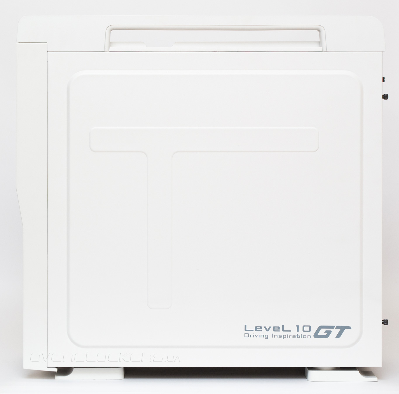 Дизайн Level 10 GT Snow Edition в огрубленной манере копирует внешние черты оригинального Level 10. Всем своим видом корпус пытается продемонстрировать, что состоит из отдельных модульных блоков, хотя, на самом деле, это обычное шасси с одним общим внутренним объемом. Нарочито подчеркнутые боковины, выдающиеся в стороны корзины жестких дисков и 5,25″ отсеков должны только усиливать впечатление модульности. В любом случае, не смотря на определенную вторичность, выглядит это все необычно. На передней панели расположены один 3,5″ и четыре 5,25″ внешних отсека, закрытые легкосъемными вентилируемыми заглушками.