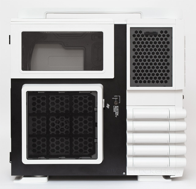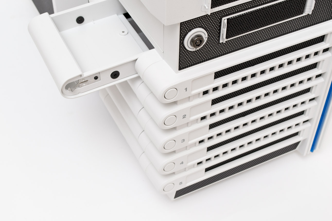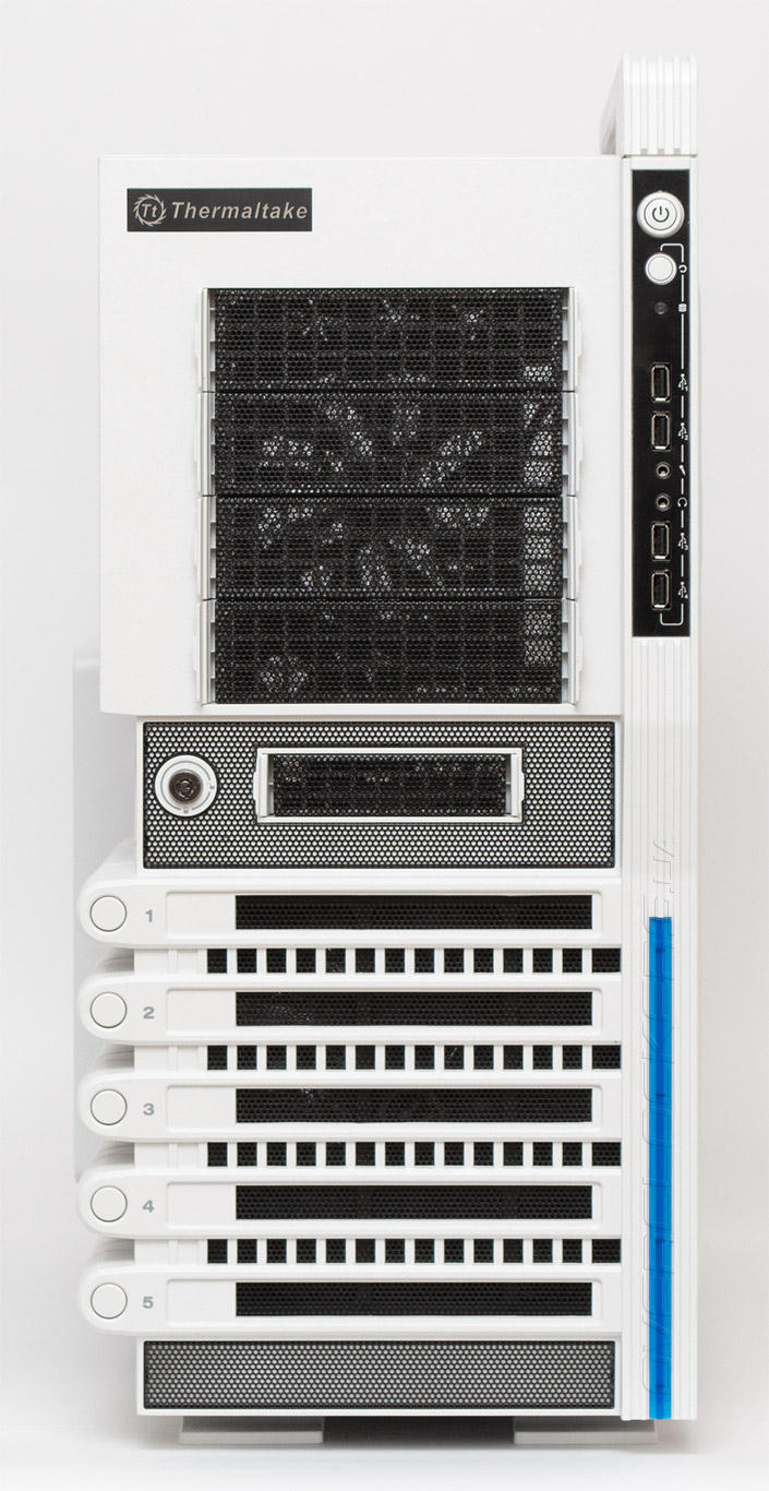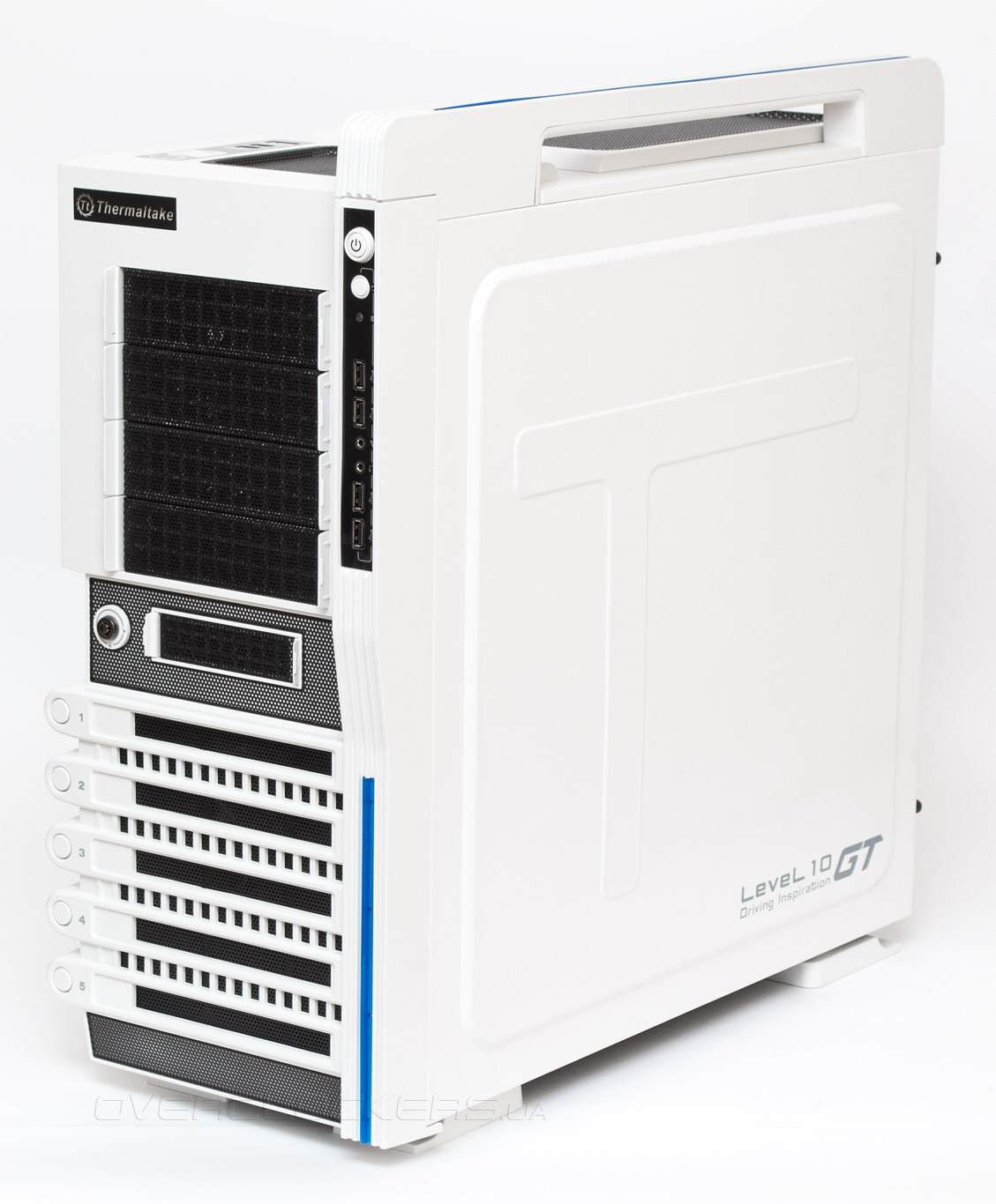 Дизайн Level 10 GT Snow Edition в огрубленной манере копирует внешние черты оригинального Level 10. Всем своим видом корпус пытается продемонстрировать, что состоит из отдельных модульных блоков, хотя, на самом деле, это обычное шасси с одним общим внутренним объемом. Нарочито подчеркнутые боковины, выдающиеся в стороны корзины жестких дисков и 5,25″ отсеков должны только усиливать впечатление модульности. В любом случае, не смотря на определенную вторичность, выглядит это все необычно. На передней панели расположены один 3,5″ и четыре 5,25″ внешних отсека, закрытые легкосъемными вентилируемыми заглушками.