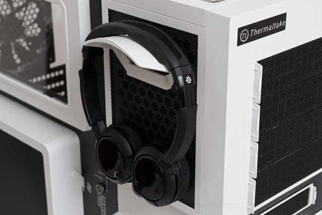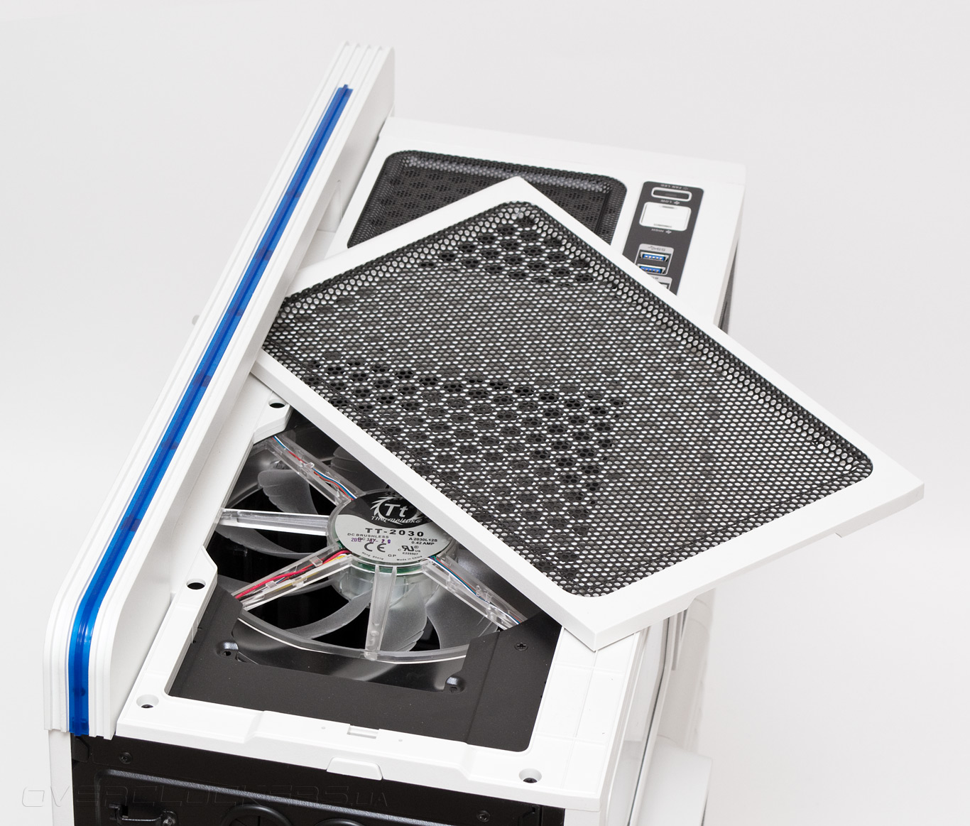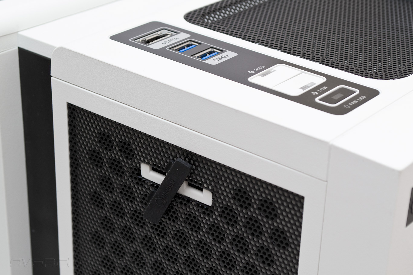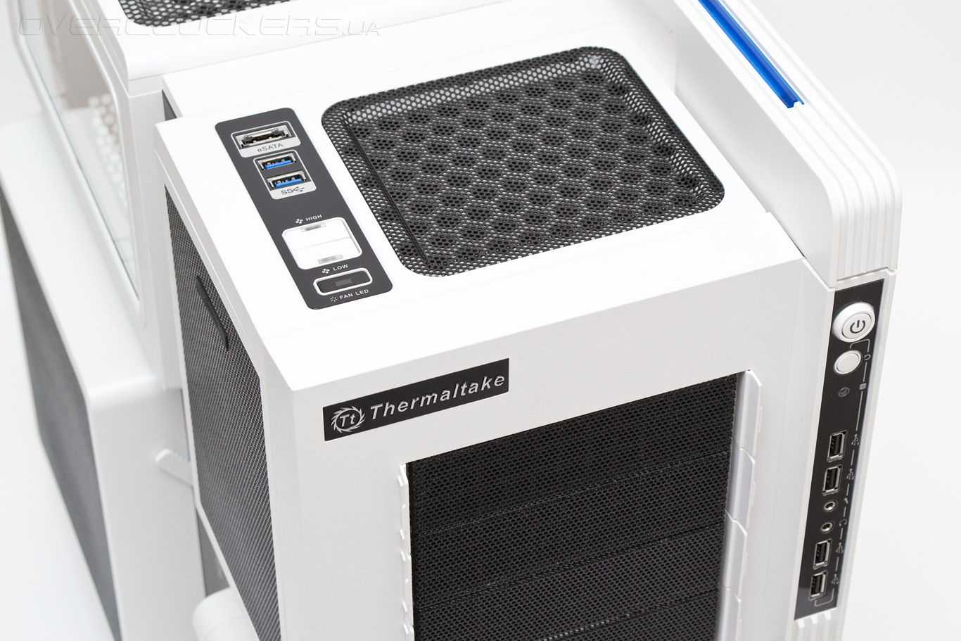 Органы управления сосредоточены на левой грани верхней панели и правой грани фронтальной, которая визуально продолжает линию ручки. Сверху расположены разъемы eSATA и USB 3.0, две кнопки контроллера трех вентиляторов и одна кнопка выбора режима подсветки пропеллеров. Спереди находятся кнопки включения (совмещенная с индикатором питания) и перезагрузки ПК, индикатор активности накопителей, четыре порта USB 2.0 и два 3,5-мм разъема для микрофона и наушников.