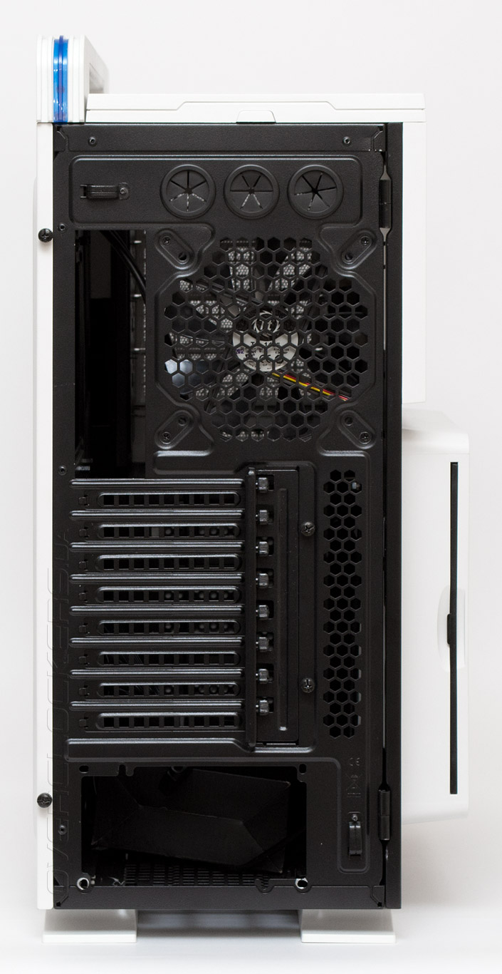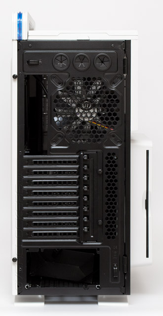Задняя панель ничем не отличается от таковой у большинства шасси. Сверху есть три отверстия для шлангов СВО, возле них слева — небольшая скоба, предназначенная для фиксации проводов. Скоба удерживается винтом с накатанной головкой изнутри корпуса. Это сделано, чтобы избежать кражи периферии на выставках и LAN-вечеринках. Посадочное место вентилятора может принять одну 120- или 140-мм модель. Вентилируемые заглушки восьми слотов расширения выведены заподлицо с задней панелью и удерживаются винтами с накатанной головкой. Отверстие для их снятия прикрывает вертикальная заглушка, удерживаемая двумя аналогичными винтами. Посадочное место блока питания позволяет ориентировать его как вентилятором вверх, так и вниз. Справа от БП находится еще одна скоба с внутренним винтом для крепления проводов.