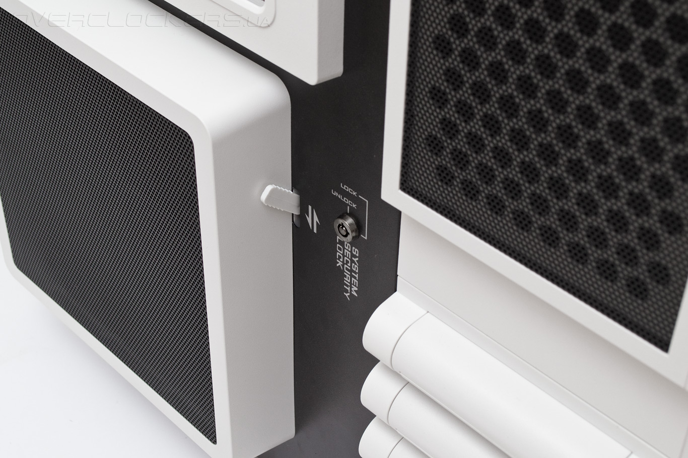 Справа от коробки бокового вентилятора есть небольшой рычажок. Он фиксируется только в крайнем верхнем положении, и сразу мне было совершенно непонятно его назначение. Грешным делом даже подумалось, что это ручка для открывания двери, ведь рядом находится замок боковой дверцы. В результате оказалось, что рычажок никак не связан с замком. Ну что же, оставим его тайну нераскрытой до момента рассмотрения внутреннего устройства корпуса.