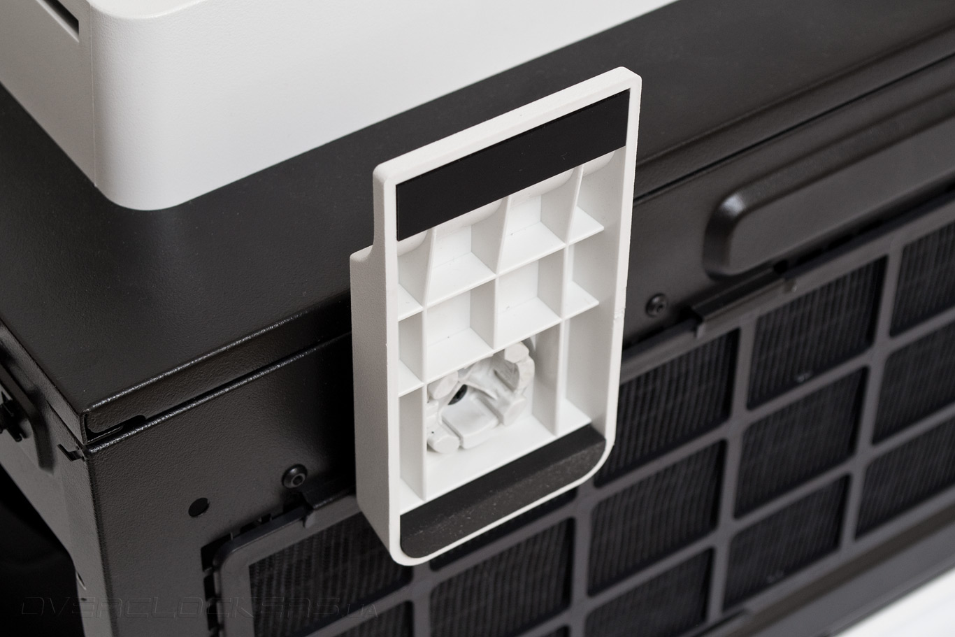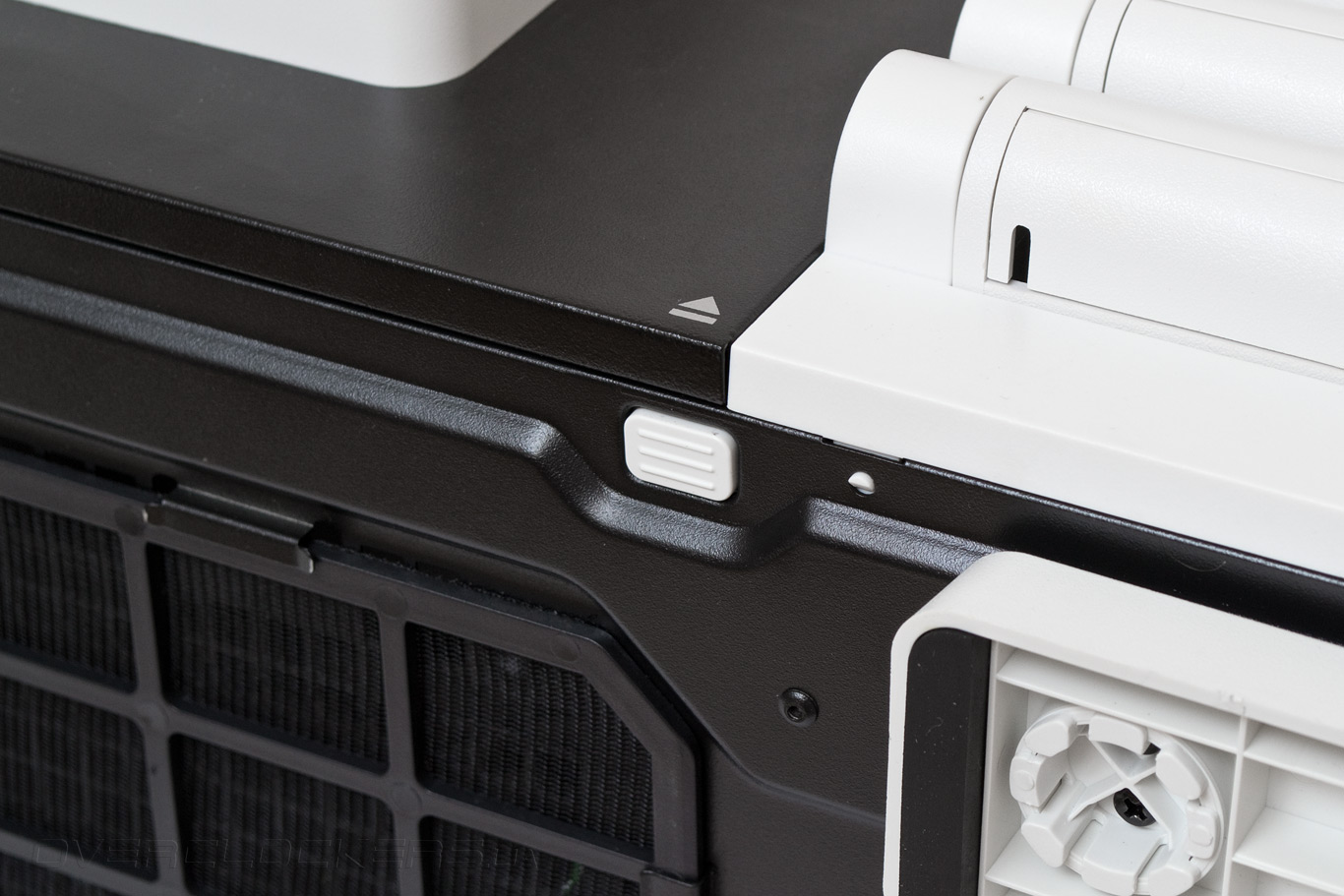 Боковой вентилятор, в кои-то веки, закрыт качественным пылевым фильтром. Чтобы извлечь фильтр, нужно нажать на его рамку в районе углубления.