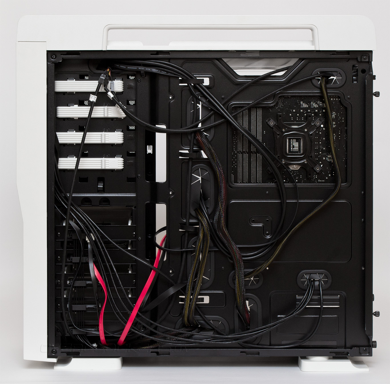 Сборка системы в корпусе Thermaltake Level 10 GT прошла просто и незаметно, поскольку ко всем элементам всегда был открыт полный доступ. Мне даже не понадобилось дополнительно стягивать провода, они сами вполне естественно расположились за поддоном. Данное шасси просто создано для пользователей, которые любят частенько заглядывать под «капот» своей системы.