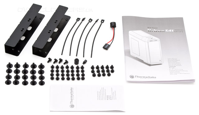 Комплект аксессуаров упакован в белую коробку, которая закреплена в салазках для жестких дисков. Внутри содержатся: