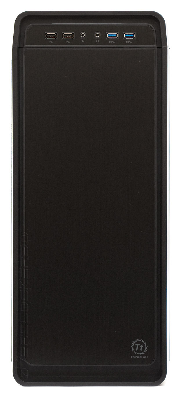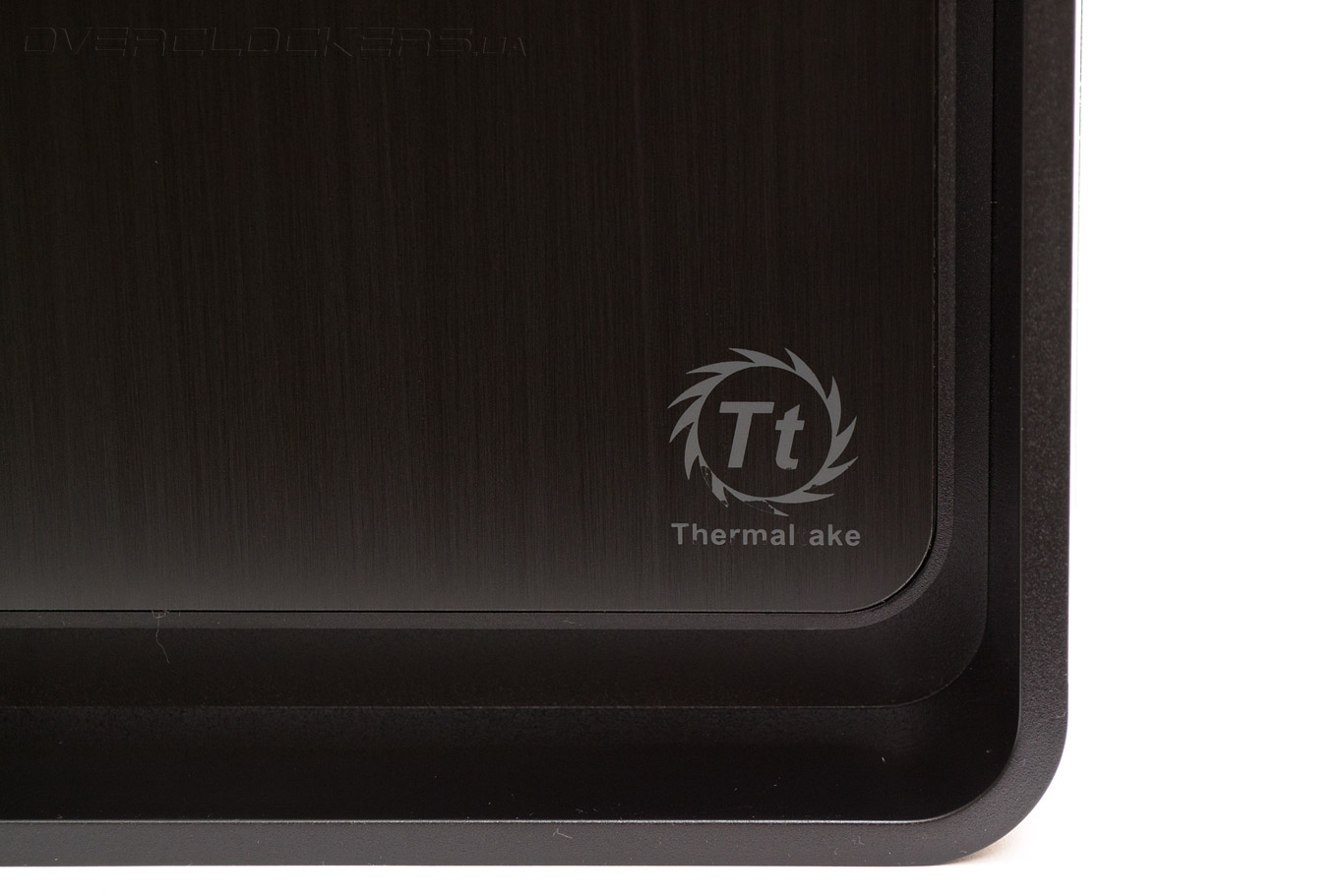Дверца не имеет видимых ручек или зазоров для открывания. В закрытом положении удерживается тремя магнитами. В правом нижнем углу, в районе логотипа Thermaltake есть углубление, взявшись за которое снизу, панель можно открыть влево, повернув на угол в 110 градусов. Внутренняя часть окантовки фронта зачем-то выполнена из глянцевого пластика, который очень хорошо собирает пыль и отпечатки пальцев.