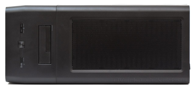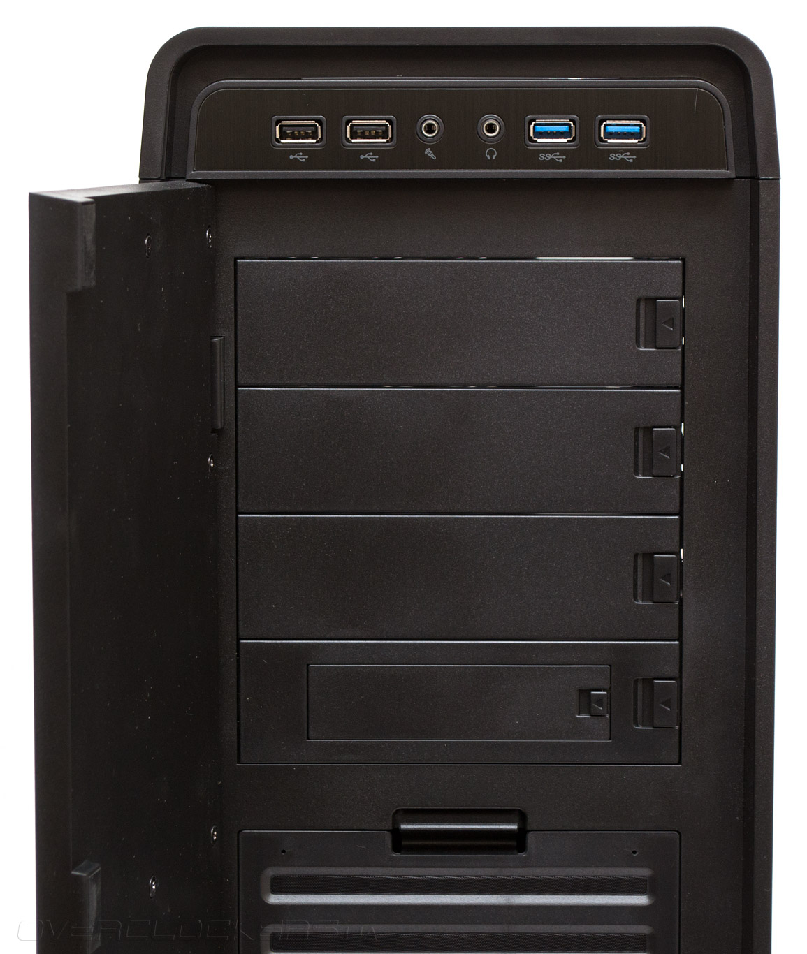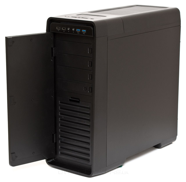 Почти вся фронтальная панель, не считая верхних USB портов, является дверцей, открывающейся влево. Тонкий слой алюминиевого сплава надежно закреплен на толстом пластиковом основании. Видимых вентиляционных отверстий нет, но воздух способен поступать внутрь через тонкие щели, проходящие по периметру между дверцей и пластиковой окантовкой.