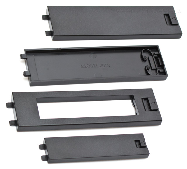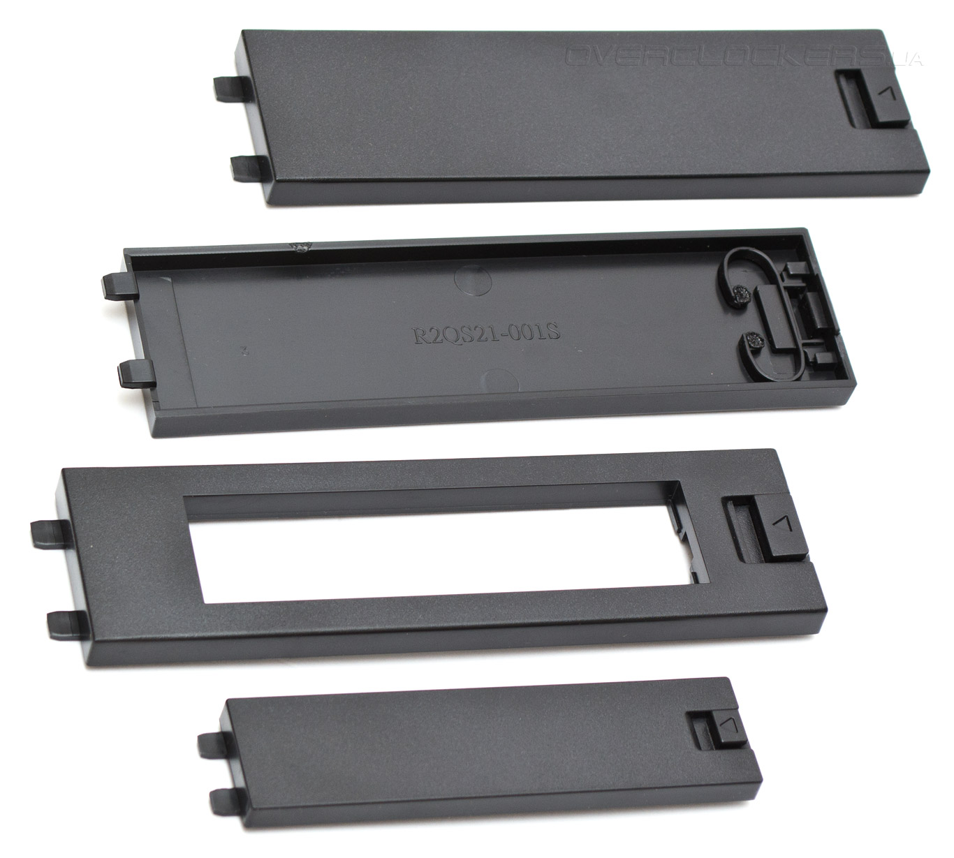 Четыре отсека формата 5,25″ закрыты легкосъемными сплошными заглушками, одна из которых имеет отверстие для 3,5″ устройства. Учитывая малый запас места между дверцей и панелью, устройства с выступающими более чем на 4 мм кнопками и рычагами управления сюда установить не получится.