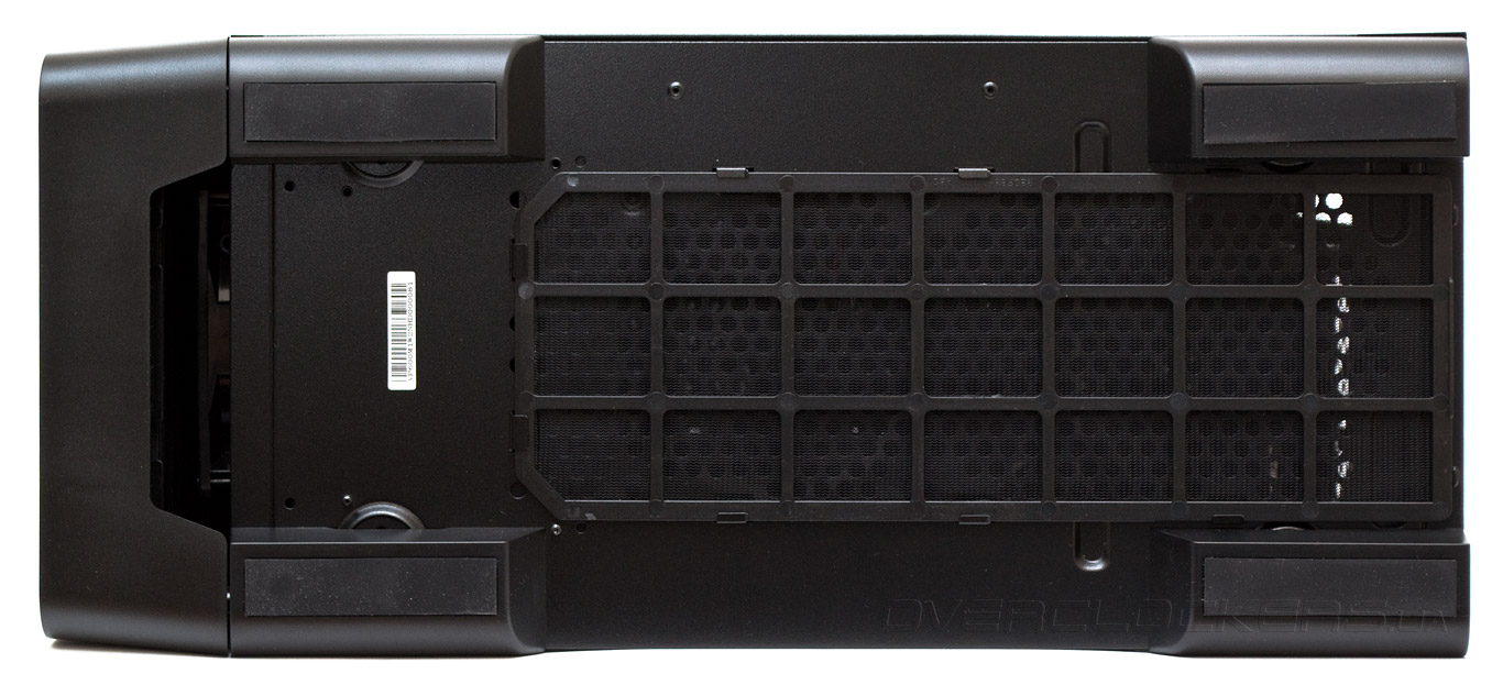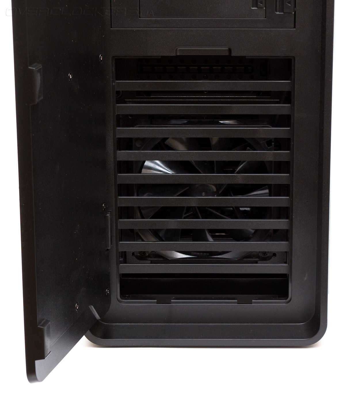 Дно корпуса имеет крупную перфорацию в центральной и передней части, закрытую длинным пылевым фильтром. Но спереди, в нижней части фронтальной панели, мы наблюдаем крупное отверстие, через которое виден передний вентилятор и через которое пыль способна беспрепятственно проникать внутрь шасси.