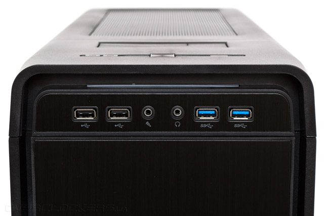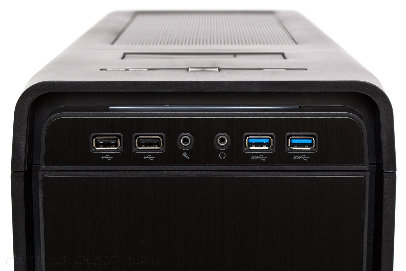 Внешние порты вынесены на верхнюю часть передней панели, что делает их использование весьма удобным и позволяет меньше беспокоиться по поводу попадания в них пыли. Слева направо расположены два USB 2.0, два 3,5-мм аудиовыхода и два порта USB 3.0, синий цвет которых несколько выбивается из общей гаммы корпуса. В углублении над внешними портами притаился продолговатый индикатор работы ПК синего цвета.