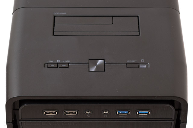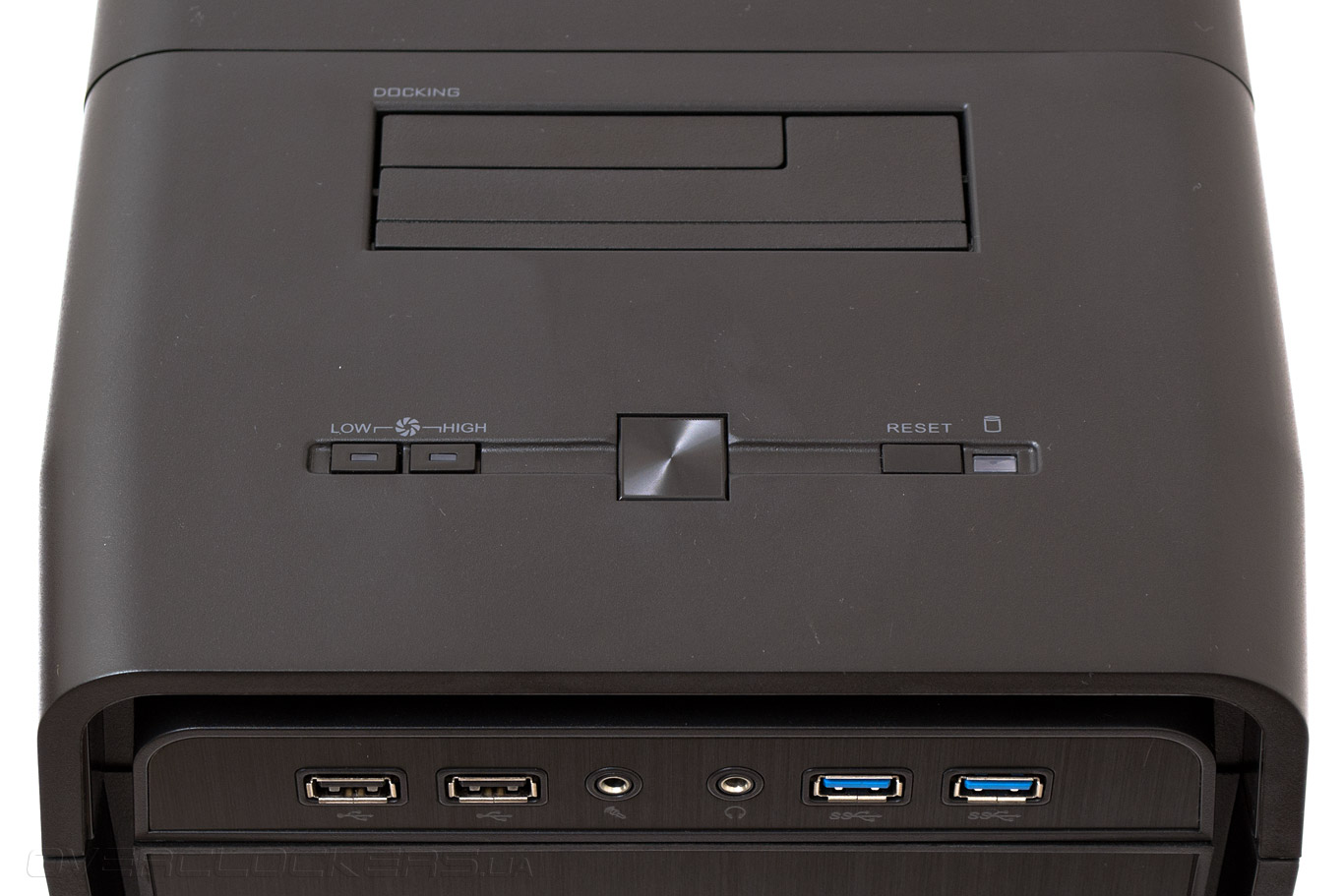 На передней части верхней панели свое место получили: док-станция для одного 2,5″ или 3,5″ накопителя (закрытые подпружиненными шторками для защиты от пыли), две подсвеченные клавиши встроенного контроллера оборотов вентилятора (режим High — 12 В и режим Low — 7 В), кнопка запуска ПК с интересной переливающейся текстурой поверхности, клавиша перезагрузки и маленький индикатор активности накопителей красного цвета.