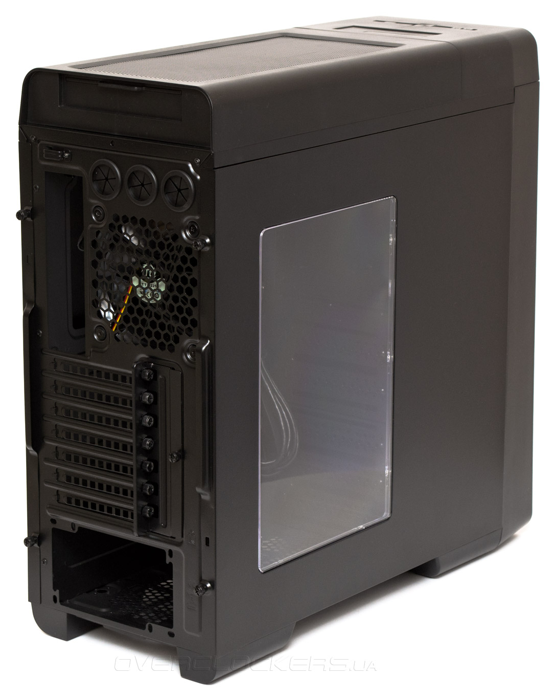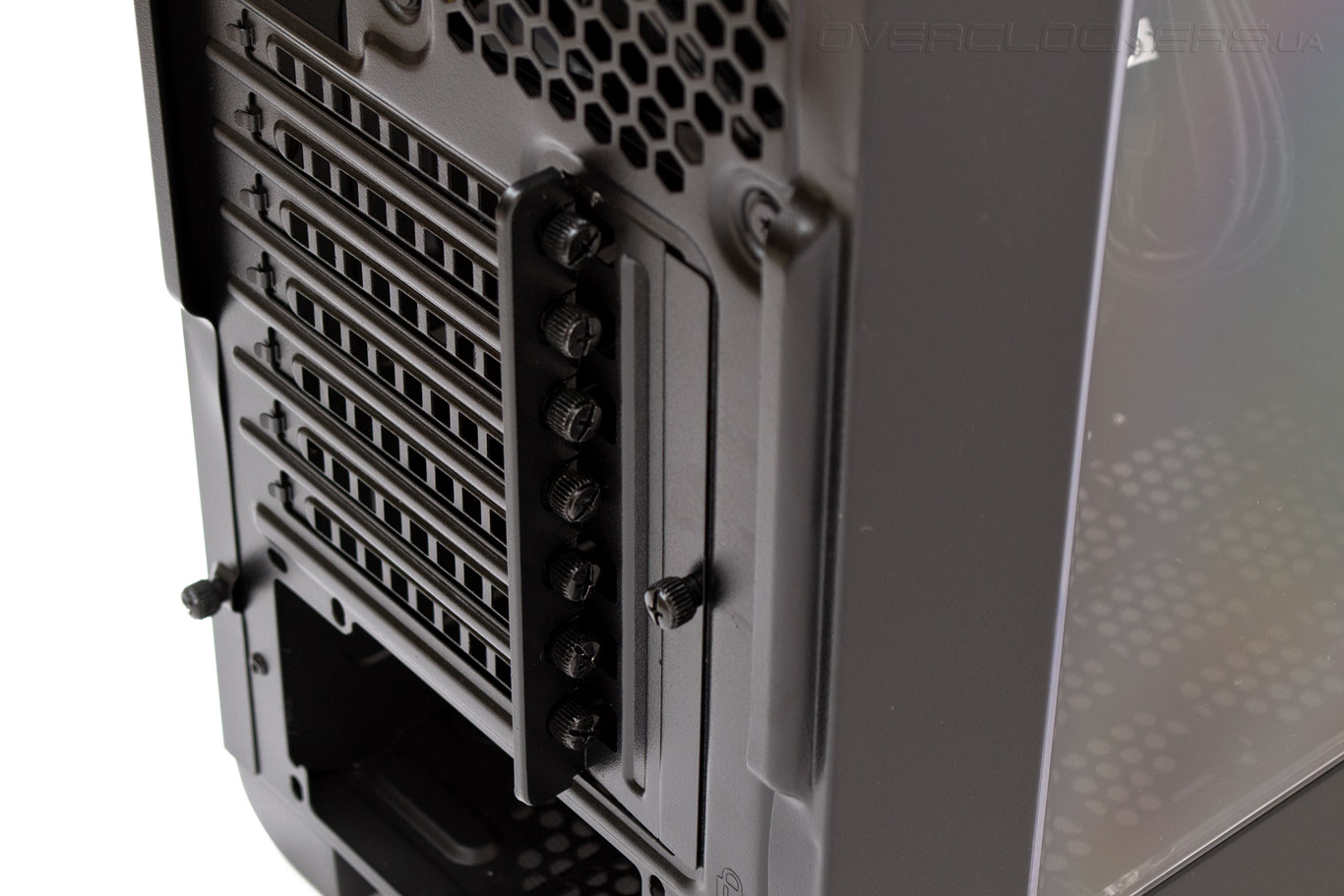 Семь слотов расширения закрыты многоразовыми вентилируемыми заглушками, которые выведены в один уровень с задней панелью, что увеличивает на пару сантиметров место, доступное для плат расширения внутри корпуса. Все заглушки и декоративная вертикальная накладка удерживаются удобными винтами с накатанной головкой.