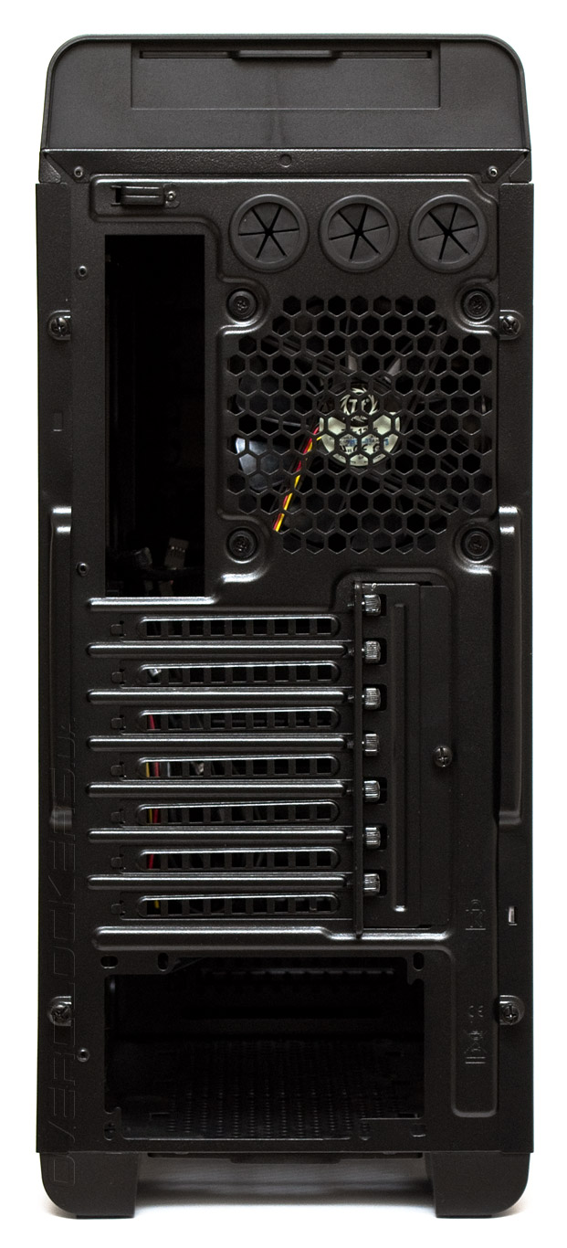 Задняя панель типична для корпуса с нижним расположением блока питания. В верхней части есть три отверстия для шлангов СВО диаметром 26 мм, закрытые резиновыми «заглушками». Под ними, за решеткой с крупными отверстиями в виде сот, находится посадочное место для 120-мм вентилятора.