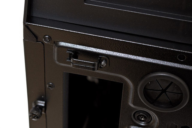 Боковые панели оснащены ручками и винтами с накатанной головкой, значительно облегчающими их снятие и установку. Причем винты остаются закрепленными в своих пазах на дверце после ее снятия, так что потерять их случайно будет очень непросто.