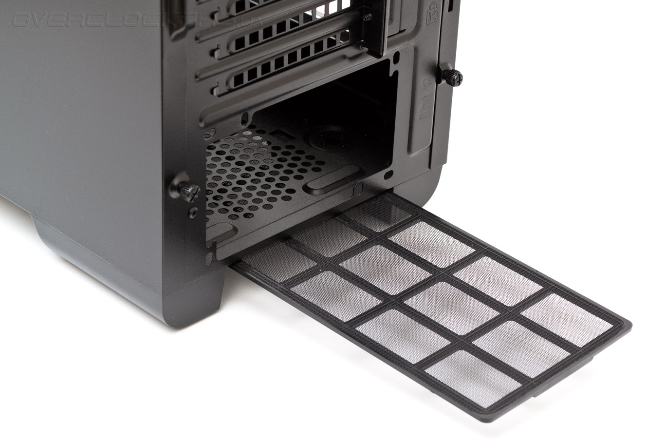 Нижняя часть корпуса закрыта пылевым фильтром. Узкие бойницы десяти воздушных отверстий оснащены мелкой качественной сеткой и имеют размер 128х6 мм, что еще больше внушает опасения по поводу вентиляции данного шасси. Сложно представить, зачем понадобилось настолько уменьшать площадь переднего воздухозаборного отверстия.