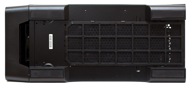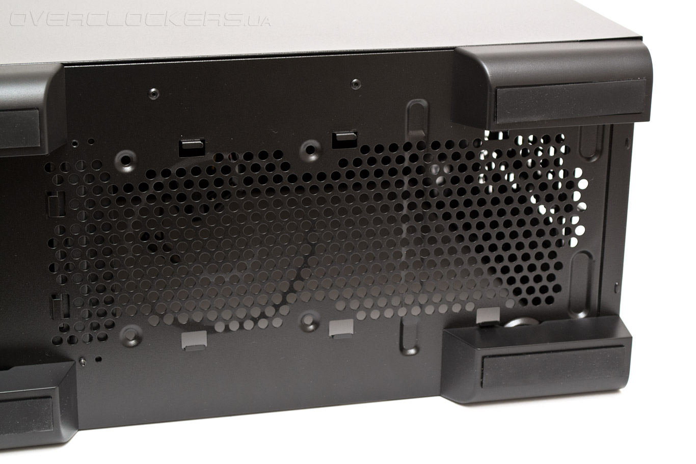 Крупные пластиковые ножки, проклеенные снизу мягкими резиновыми вставками, поднимают корпус над поверхностью на рекордную высоту в 31 мм. По центру дна есть посадочное место для одного 120-мм вентилятора, который может значительно улучшить ситуацию с обдувом видеоадаптеров.