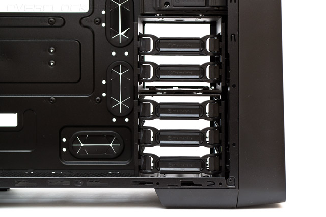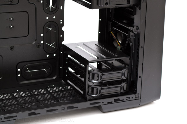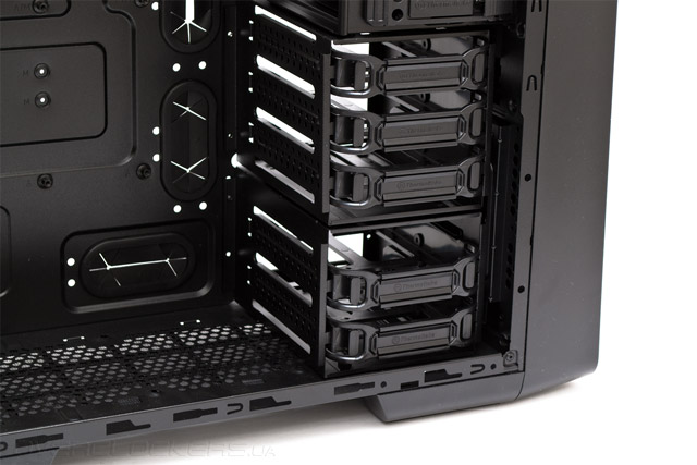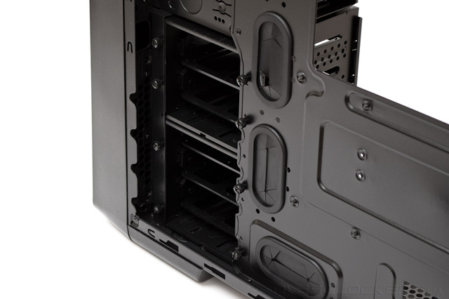 Пластиковые салазки могут принять как 3,5″ так и 2,5″ накопители, но фиксироваться они будут исключительно с помощью соответствующих винтов. Для жестких дисков предусмотрены резиновые изоляторы вибраций в месте крепления винтов. Но сами салазки довольно неплотно сидят в корзинах, что может привести к лишнему шуму.