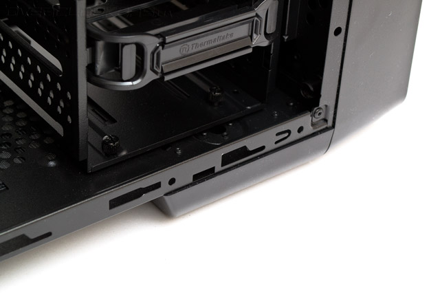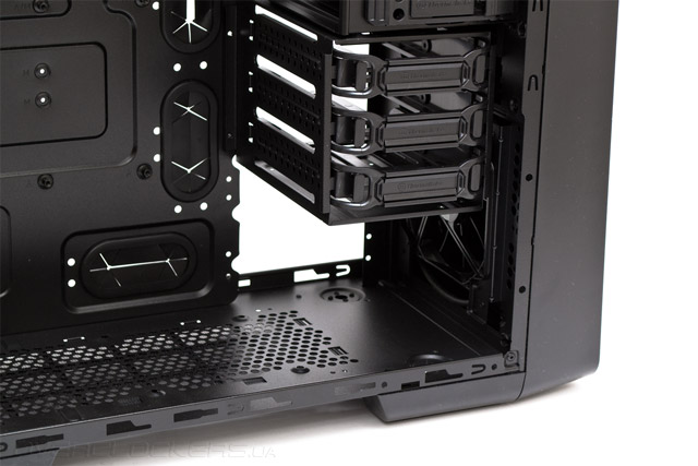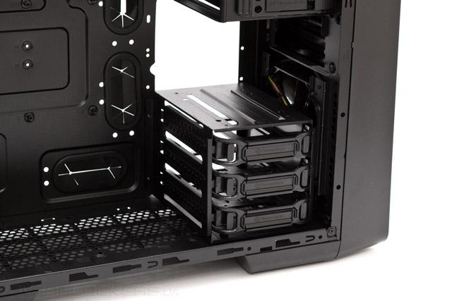 Такие атавизмы как два отверстия для 3,5″ отсеков и разрезанные наполовину отверстия крепления под 200-мм вентилятор (который сюда не поместится по глубине) указывают, что при разработке Thermaltake Urban S41 использовалось слегка модифицированное шасси от другой модели корпуса.