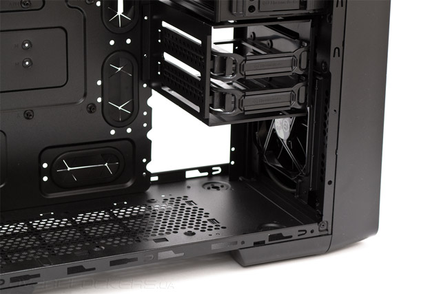 Поддон в Urban S41 сделан несколько специфично. Во-первых, как уже упоминалось, он не имеет ребра поперечной жесткости и без корзин начинает просто извиваться под нагрузкой. Во-вторых, вместо проушин для фиксации кабельных стяжек здесь сделаны сдвоенные отверстия в количестве семи штук. В остальном ничего особенного — четыре отверстия для укладки проводов, закрытые резиновыми шторками и огромный вырез под усилительную пластину процессорного кулера. Запас места от поддона до боковой панели составляет от 21 до 23 мм, чего должно быть достаточно для скрытой укладки проводов.