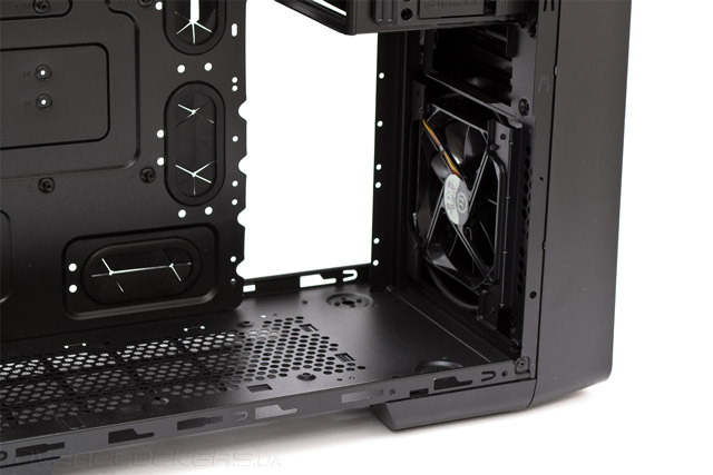 На вдув здесь установлен 120-мм вентилятор, аналогичный модели расположенной сзади, но закрепленный не шурупами, а винтами. Кроме того, есть посадочное место и для 140-мм пропеллера.