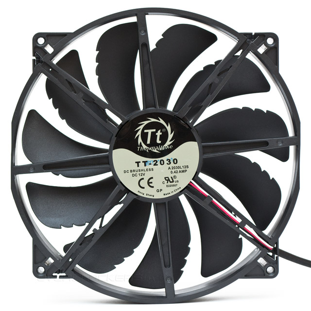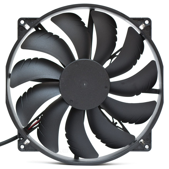 200-мм вентилятор прикручен длинными винтами и имеет толщину 30 мм. Кабель питания трехконтактный, длина — 500 мм. Крыльчатка бесшумно стартует с 3 В и 300 об/мин, легкий рокот подшипника слышно только если приблизиться вплотную. До 450 об/мин и 5 В сохраняется едва различимый фон от подшипника, который начинает заметно шуметь с 7 В и 600 об/мин. На полной скорости в 800 об/мин проявляется аэродинамический шум воздуха и вентилятор становится очень громким. Маркировка и электрические характеристики видны на фотографии.