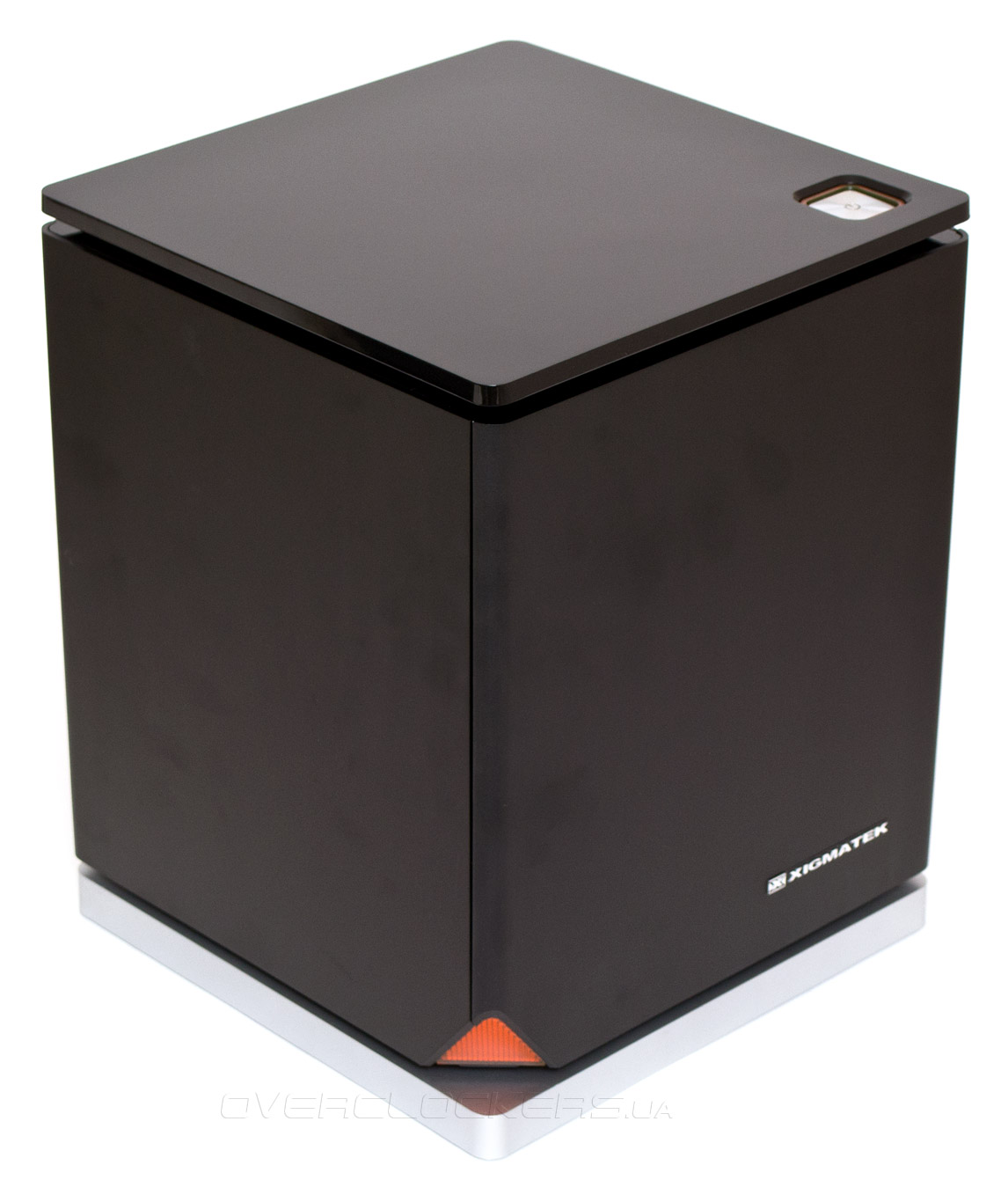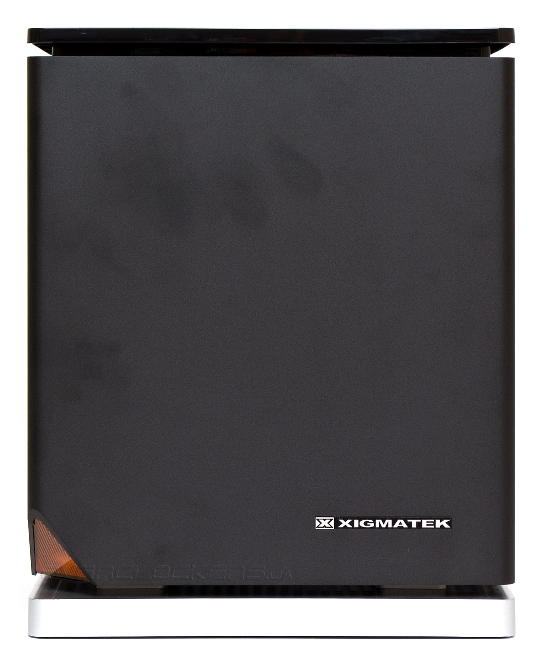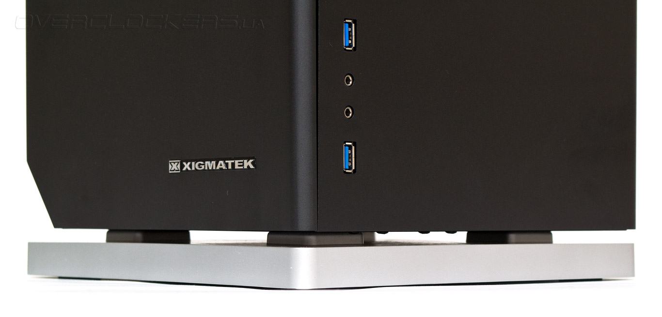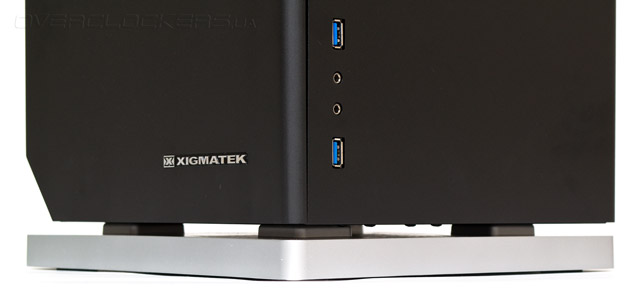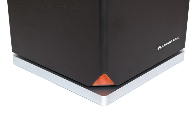 Передняя панель не имеет никаких внешних портов. В правой ее нижней части находится серебристый логотип компании Xigmatek, а левый угол стильно скошен внутрь и закрыт пластиковым оранжевым индикатором треугольной формы.