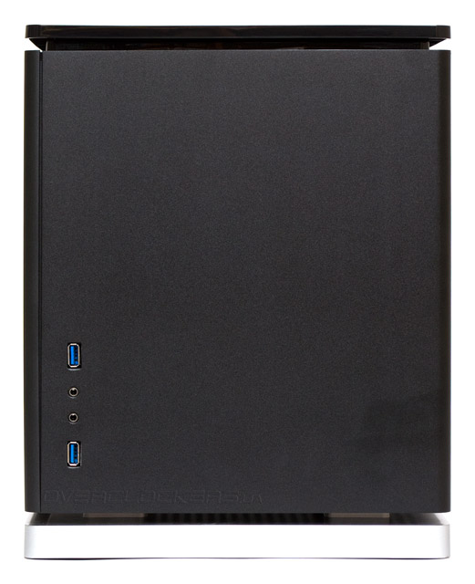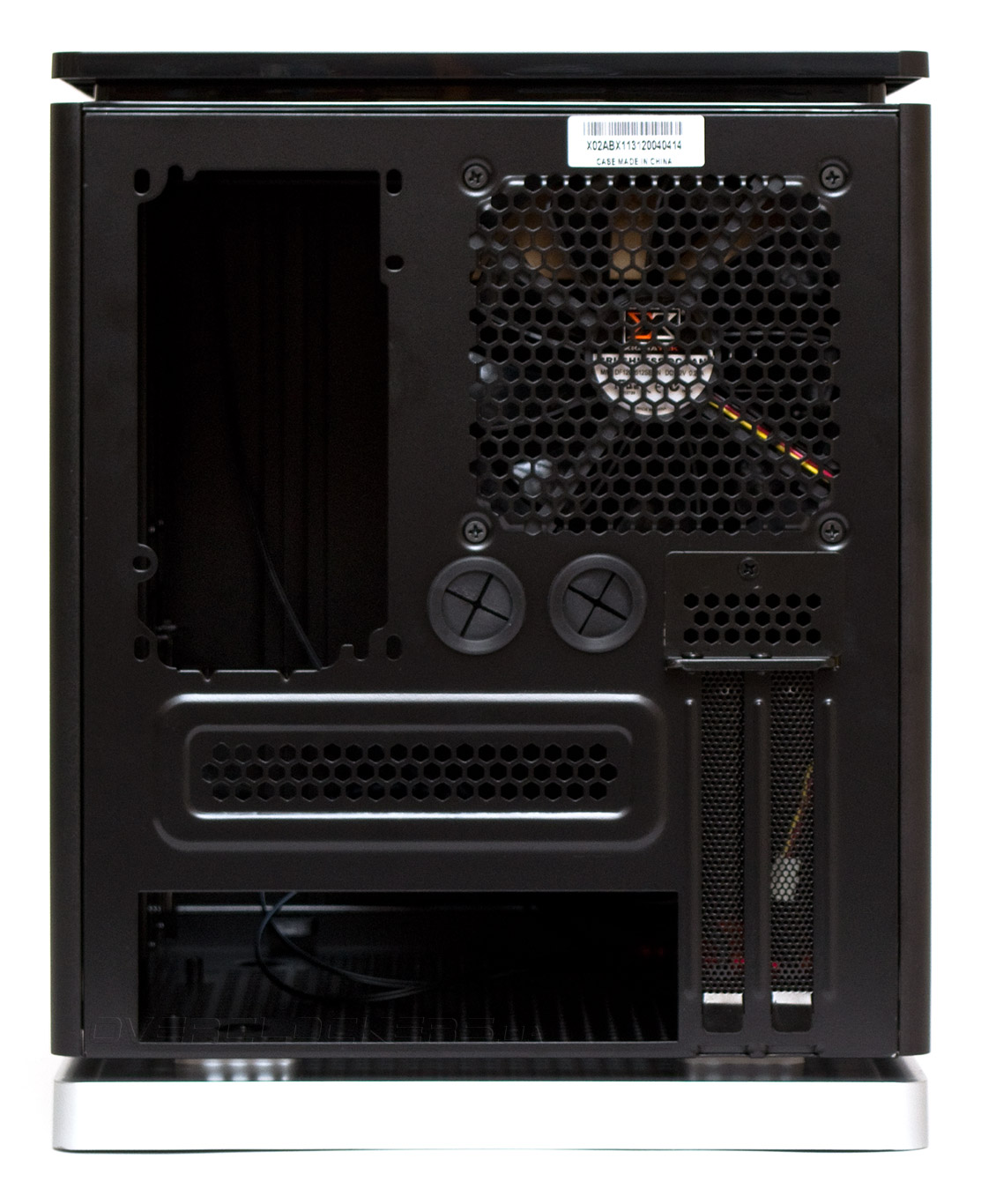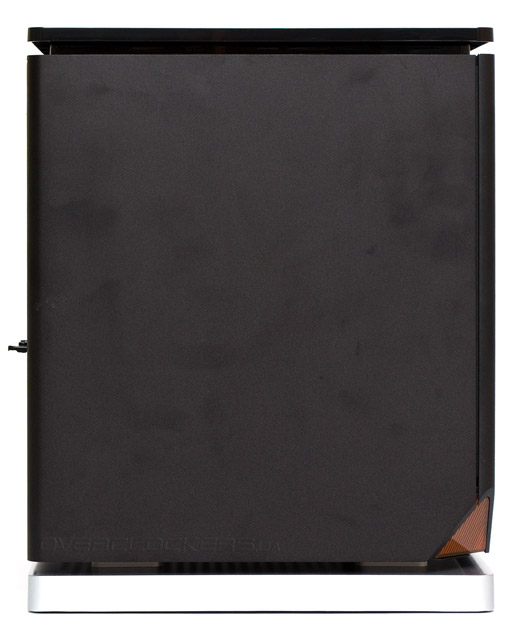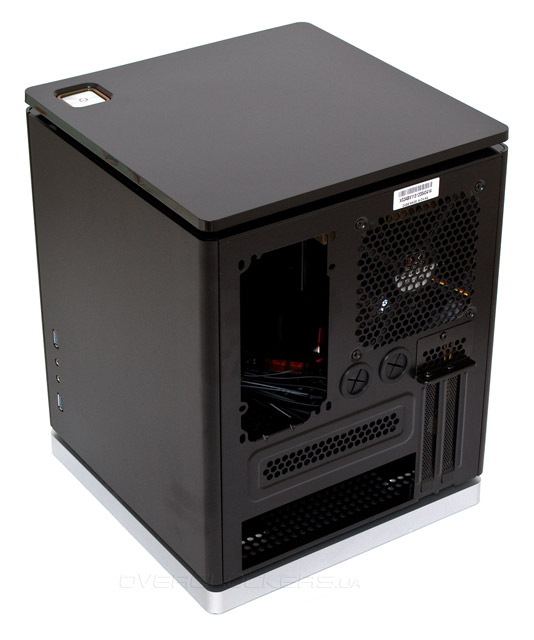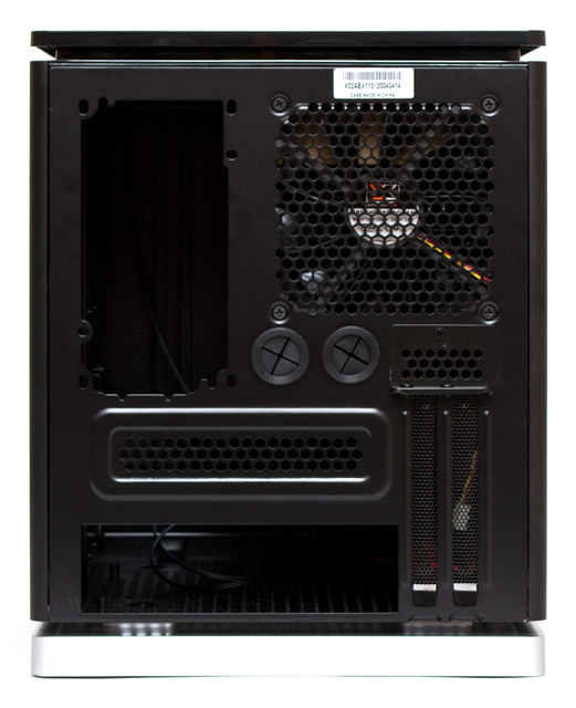 Внимательное изучение задней панели указывает на то, что материнская плата располагается внизу корпуса горизонтально. Над ней нависает поставленный набок блок питания. БП можно поворачивать вентилятором вправо или влево. Хотя при ориентации влево он не сможет содействовать вентиляции системы. А справа сверху еще остается место для одного вытяжного 120-мм вентилятора, под которым примостились две прорезиненные заглушки отверстий для шлангов СВО.