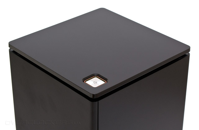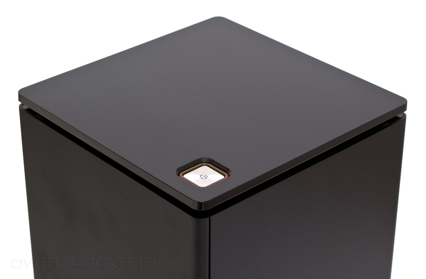 Верхняя панель сделана из полностью глянцевого пластика с сильным зеркальным эффектом и напоминает крышку рояля. В ее переднем правом углу расположена крупная серебристая кнопка запуска системы, к сожалению, не снабженная подсветкой. Вентиляционных отверстий на горизонтальных стыках панелей нет, углубления там сделаны сугубо в декоративных целях. Клавиша перезагрузки системы отсутствует.