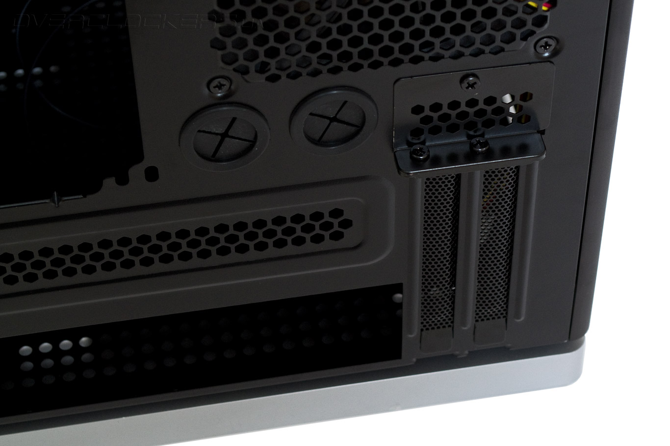 Два слота карт расширения закрыты вентилируемыми заглушками, которые крепятся на наружной стороне корпуса винтами и накрываются декоративной Г-образной панелью.