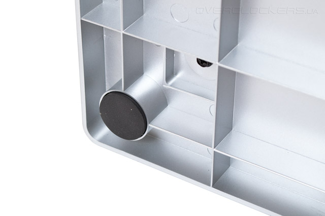 Нижняя серая подставка пластмассовая и служит в большей мере декоративным элементом. Однако, между ней и металлическим перфорированным основанием корпуса есть 8-мм зазор, через который предполагается поступление основного вентиляционного потока воздуха внутрь шасси.