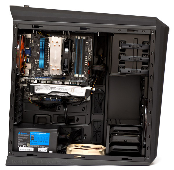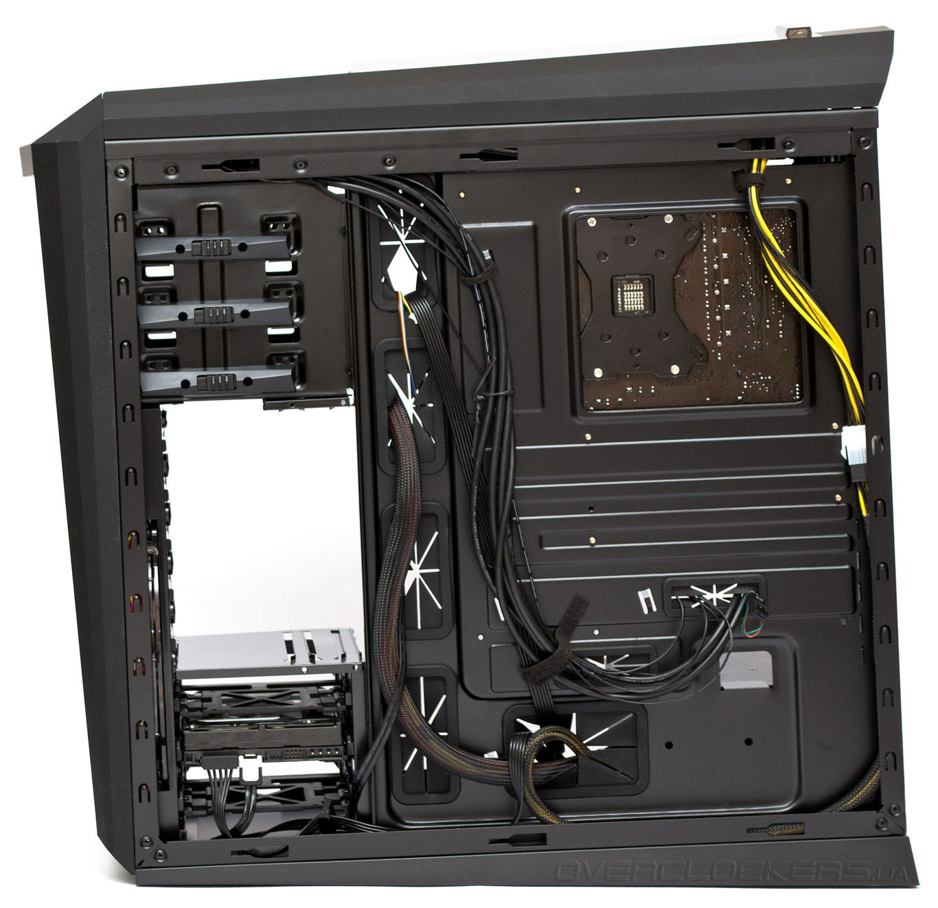 Провода удалось равномерно распределить за поддоном материнской платы и нормально закрыть правую дверцу. Отверстие усилительной пластины слегка не совпало с положением процессорного разъема. Для подключения кабеля питания процессора понадобился удлинитель. Средняя корзина накопителей была снята, чтобы достичь максимально возможного воздушного потока.