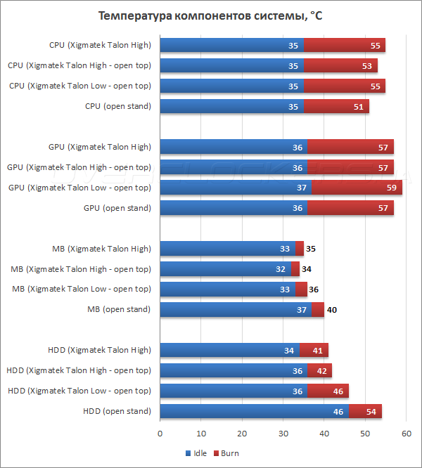Тепловая нагрузка создавалась с помощью одновременной работы стресс-тестов LinX 0.6.4 с 2048 МБ выделенной памяти и MSI Combustor 2.4 на протяжении 10 минут после стабилизации температуры. Нагрузка на жесткий диск производилась программой Crystal Disk Mark 3.0.1 х64. В конце цикла тестирования система работала 10 минут в холостом режиме для определения минимальных тепловых показателей. Температура окружающей среды составляла 28 градусов Цельсия. Скорости вентиляторов процессорного кулера и видеокарты зафиксированы на максимальных оборотах. Пиковое энергопотребление системы составило 307 ватт. В корпусе были установлены два дополнительных 120-мм вентилятора сверху — на выдув, и один 140 мм снизу — на вдув. Тестирование проводилось в трех режимах: