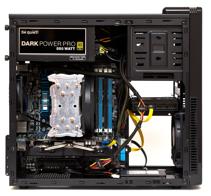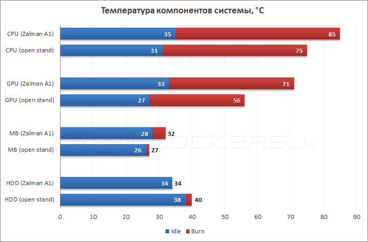 Тепловая нагрузка создавалась с помощью одновременной работы стресс-тестов LinX 0.6.5 с 2048 МБ выделенной памяти и MSI Кombustor 2.5 на протяжении 10 минут после стабилизации температуры. Нагрузка на жесткий диск производилась программой Crystal Disk Mark 3.0.3 х64. В конце цикла тестирования система работала 10 минут в холостом режиме для определения минимальных тепловых показателей. Температура окружающей среды равнялась 25 градусам Цельсия. Скорости вентиляторов процессорного кулера и видеокарты зафиксированы на максимальных оборотах. Пиковое энергопотребление системы составило 304 ватта. Спереди был установлен на вдув дополнительный 120-мм вентилятор. Тестирование проводилось в единственном режиме сравнения с открытым стендом.