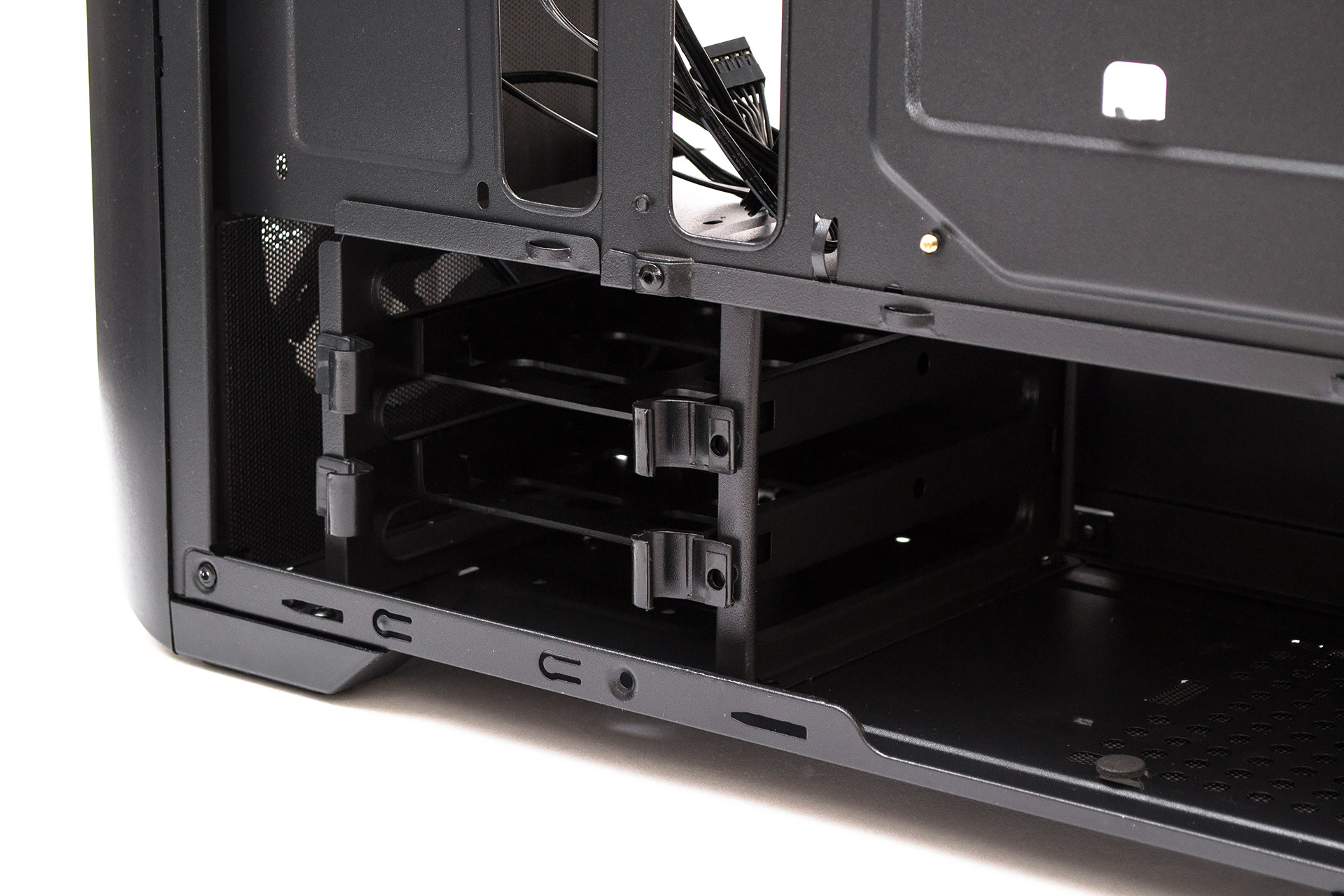 Кожух блока питания с вентиляционными щелями в задней и средней части сверху. На них даже можно закрепить сверху два 120-мм пропеллера, причём как при помощи винтов, так и шурупами. В передней части кожуха есть прорезь глубиной в 40 мм, теоретически туда можно поместить вентиляторы или радиатор не шире 120 мм. Перед вырезом есть набор посадочных отверстий для 2,5″ накопителя, который предполагается крепить винтами изнутри. Ближе к поддону материнской платы есть пара отверстий для протяжки проводов.