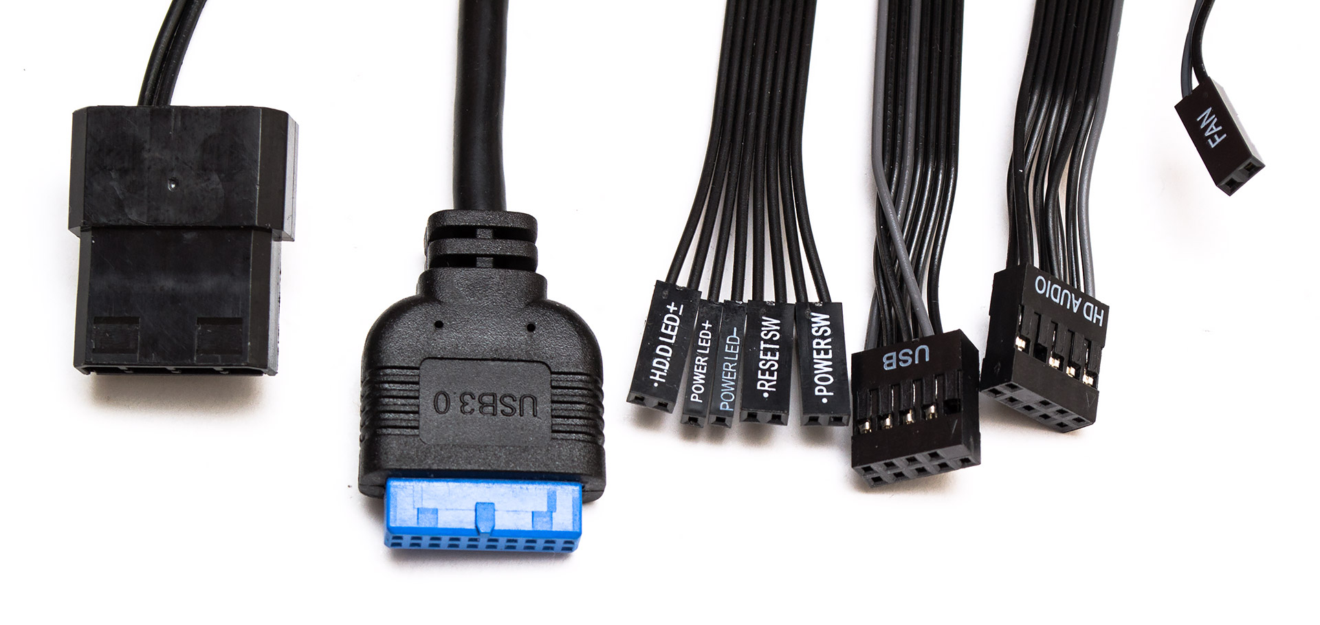 В набор кабелей от корпуса входит разъем «молекс» для питания контроллера вентиляторов, колодка USB 3.0, четыре пары проводов от кнопок запуска и перезагрузки системы, индикатора питания и активности накопителей, колодка USB 2.0, шнур HD Audio, и кабель от кнопки переключения контроллера. Все провода окрашены в черный цвет и имеют достаточную для подключения длину.