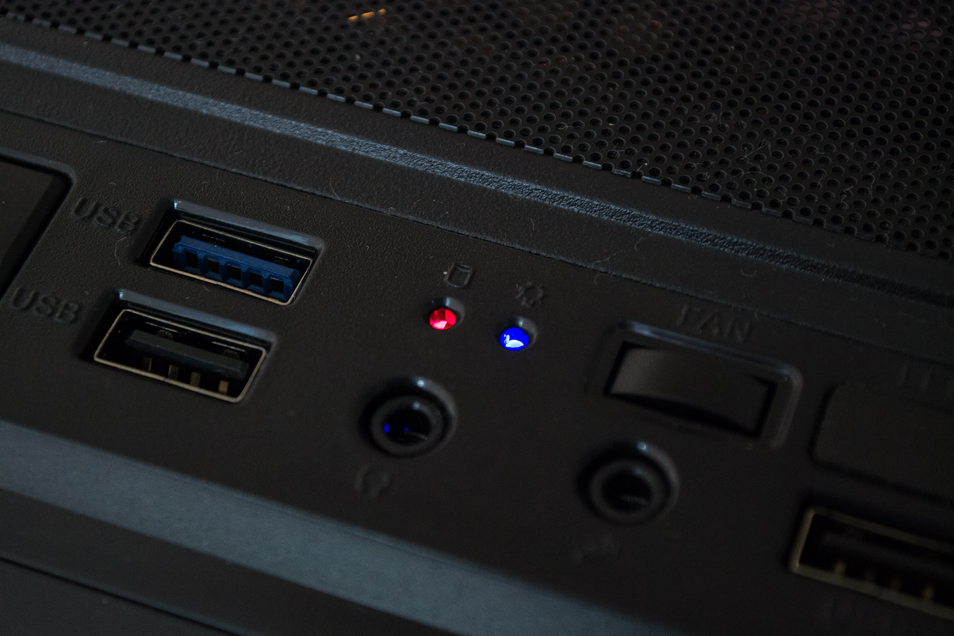 Внешние порты и кнопки находятся на верхней грани фронтальной панели. Слева расположена треугольная кнопка старта ПК, один порт USB 3.0 и еще один USB 2.0 под ним, посередине — два 3,5-мм аудио-разъема, над которыми есть индикаторы активности накопителей и питания системы, а также совмещенная клавиша переключения режима вентиляции и подсветки. Справа есть ещё один порт USB 2.0 и треугольная кнопка перезагрузки системы. Вместо кнопки Led здесь установлена заглушка.