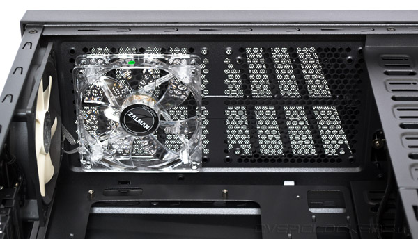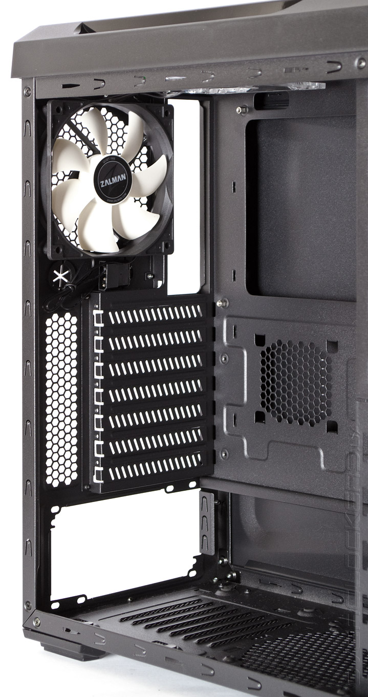 Под верхней крышкой предустановлен прозрачный 120-мм вытяжной вентилятор с синей подсветкой, которого нет в обычной версии Zalman Z12. Поскольку он идентичен переднему пропеллеру, про его технические характеристики мы расскажем позже, чтобы не повторяться.