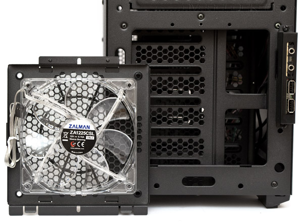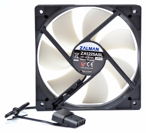 В качестве вытяжного 120-мм вентилятора установлен наш старый знакомый — Zalman ZA1225ASL, со скоростью вращения 1200 об/мин, силой тока 0,16 А и потреблением 1,92 ватта. Подключение к питанию осуществляется через «молекс».