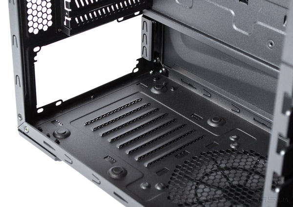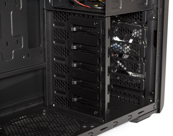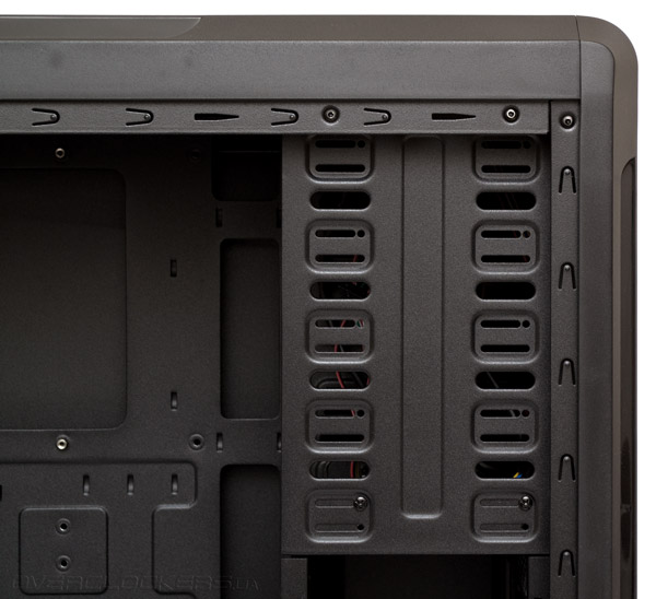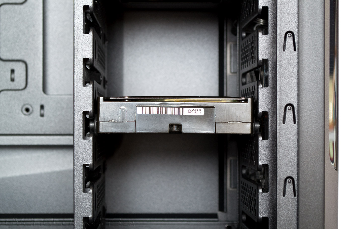 Корзина накопителей рассчитана на пять дисков формата 3,5”. Стенки перфорированные, что обещает неплохой воздушный поток. На внутренней стороне корзины закреплена система быстрых пластиковых фиксаторов для жестких дисков, которая отнимает 10 мм по длине у плат расширения.