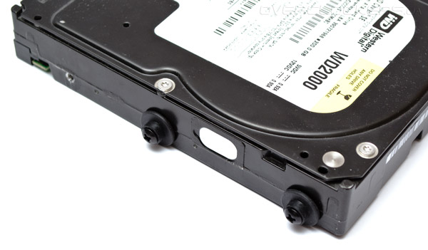 Для установки диска в корзины требуется привинтить к нему четыре резиновых демпфера. Обращаем внимание читателей, что на картинке ниже показан правильный (указанный в инструкции) способ крепления виброизоляторов — шляпками к диску. Если же развернуть демпферы шляпками наружу, то их будет проблематично вставить в корзину.
