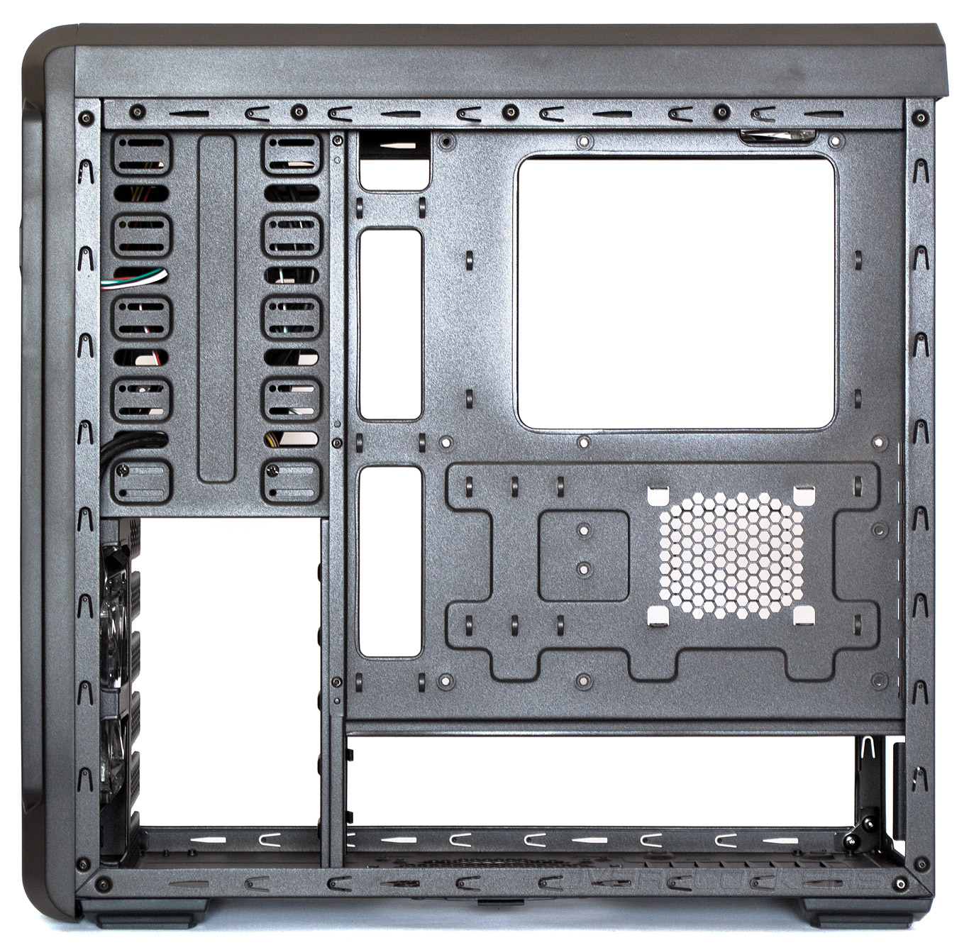 Развернув шасси, видим одно из кардинальных улучшений данного корпуса. Вырез под усилительную пластину процессорного кулера стал гораздо больше и теперь подходит к расположению всех современных сокетов. Отверстие для удлинителя питания процессора в верхнем правом углу перекрывается установленной материнской платой, поэтому сам удлинитель лучше проложить заблаговременно. Клиренс для укладки кабелей за поддоном составляет 22 мм. Чуть ниже выреза, в районе перфорации, расположены лапки, за которые можно закрепить один твердотельный накопитель. Однако подключить к нему сигнальный кабель и питание выйдет, только если вилки проводов будут прямыми, а не Г-образными.