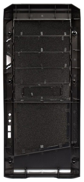 Снять переднюю крышку корпуса достаточно легко. Для этого нужно потянуть панель снизу на себя и освободить шесть пластиковых креплений типа «тюльпан». Если крышка не поддается, можно помочь себе — выдавив крепления изнутри. Итак, здесь мы наблюдаем, что четыре отсека 5,25” закрыты многоразовыми заглушками, а нижний вентилятор закрыт легкосъемным пылевым фильтром.