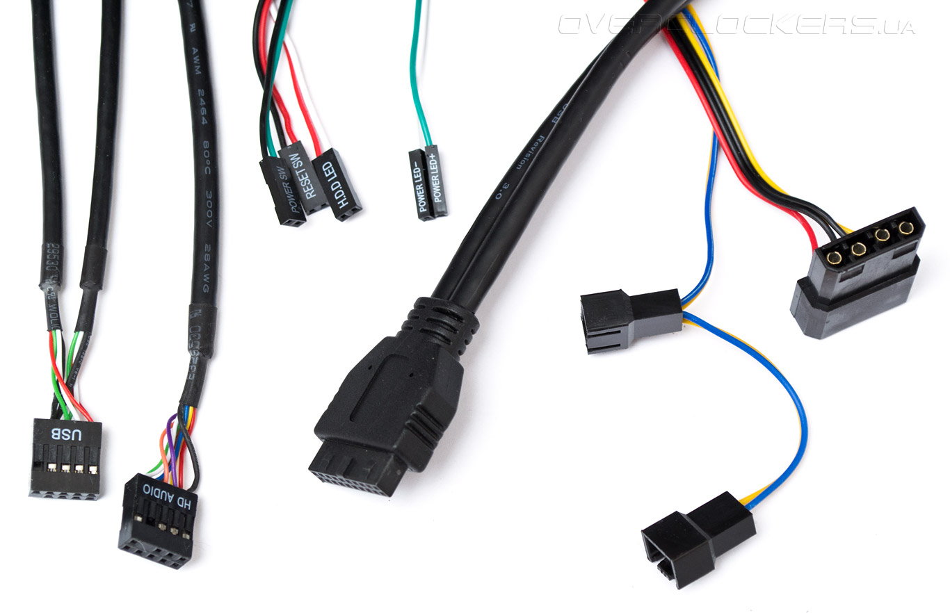 Набор проводов включает: разъем для внутренней колодки USB 3.0, два трехконтактных разъема и один «молекс» от контроллера вентиляторов, кабель HDAudio и USB 2.0, четыре провода от кнопок и индикаторов передней панели. Кстати эти четыре провода больше не нужно подключать к самим кнопкам, как это было в корпусах Zalman Z9 и Zalman Z11, хотя упоминание в инструкции об этой процедуре осталось.