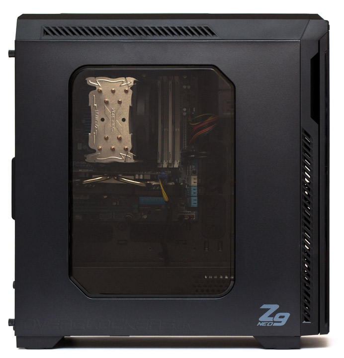 Левая боковая панель украшена крупным дымчатым акриловым окном, размером 350х250 мм. Оно имеет фигурные уголки и выступает на 5 мм над поверхностью двери. На боковых гранях передней и верхней панелей виден ряд вентиляционных отверстий для забора холодного воздуха и отвода горячего. Боковая дверца снимается по направлению назад и снабжена штампованной ручкой. Держится на двух винтах с пластиковой накатанной головкой.