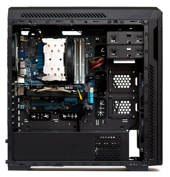 Спереди, на вдув, предустановленны еще два 120-мм вентилятора модели ZA1225ASL, аналогичные заднему пропеллеру по характеристикам, однако с подключением к питанию «молексом». В итоге шасси получается укомплектованным полным набором из пяти 120-мм вентиляторов, четыре из которых питаются через «молекс», а один (задний) — через трехконтактный разъем.