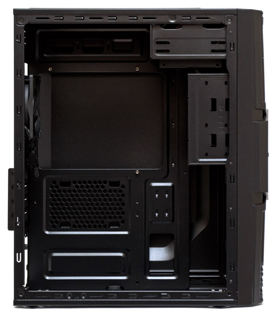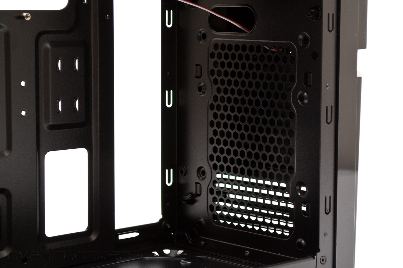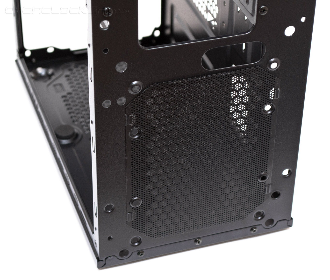 На внутренней части передней панели предусмотрены посадочные места для одного 120-мм вентилятора, который можно смонтировать в нижнее положение или приподняв на пару сантиметров вверх.