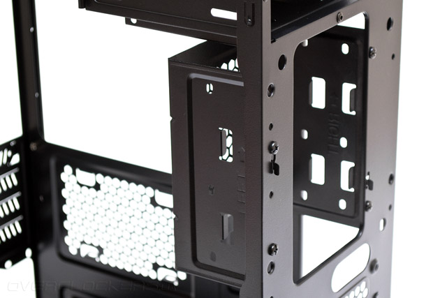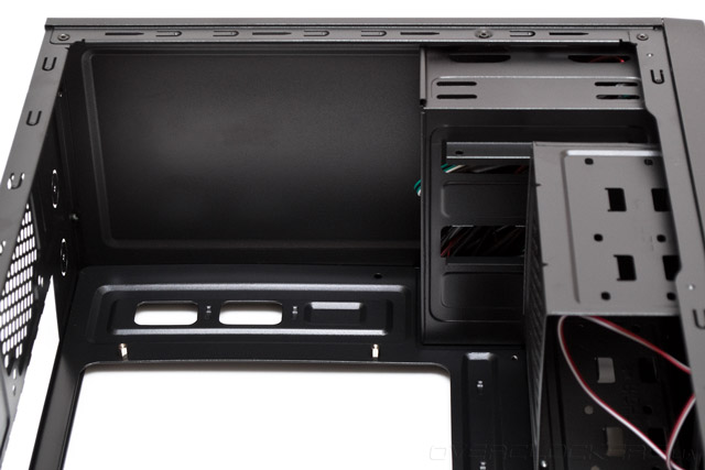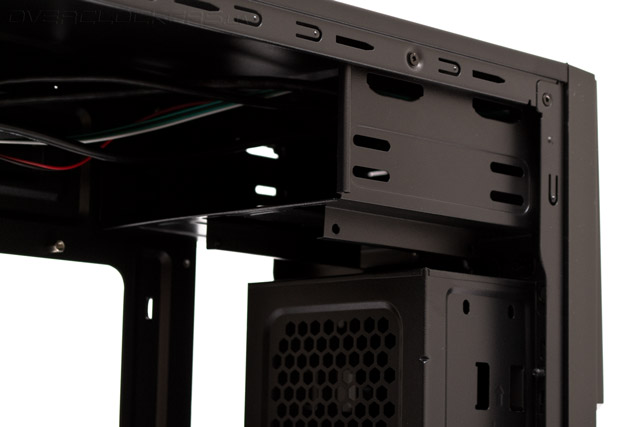 Сверху расположен отсек для единственного 5,25″ устройства. Под этим отсеком есть горизонтальные рельсы для второго 2,5″ накопителя.