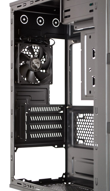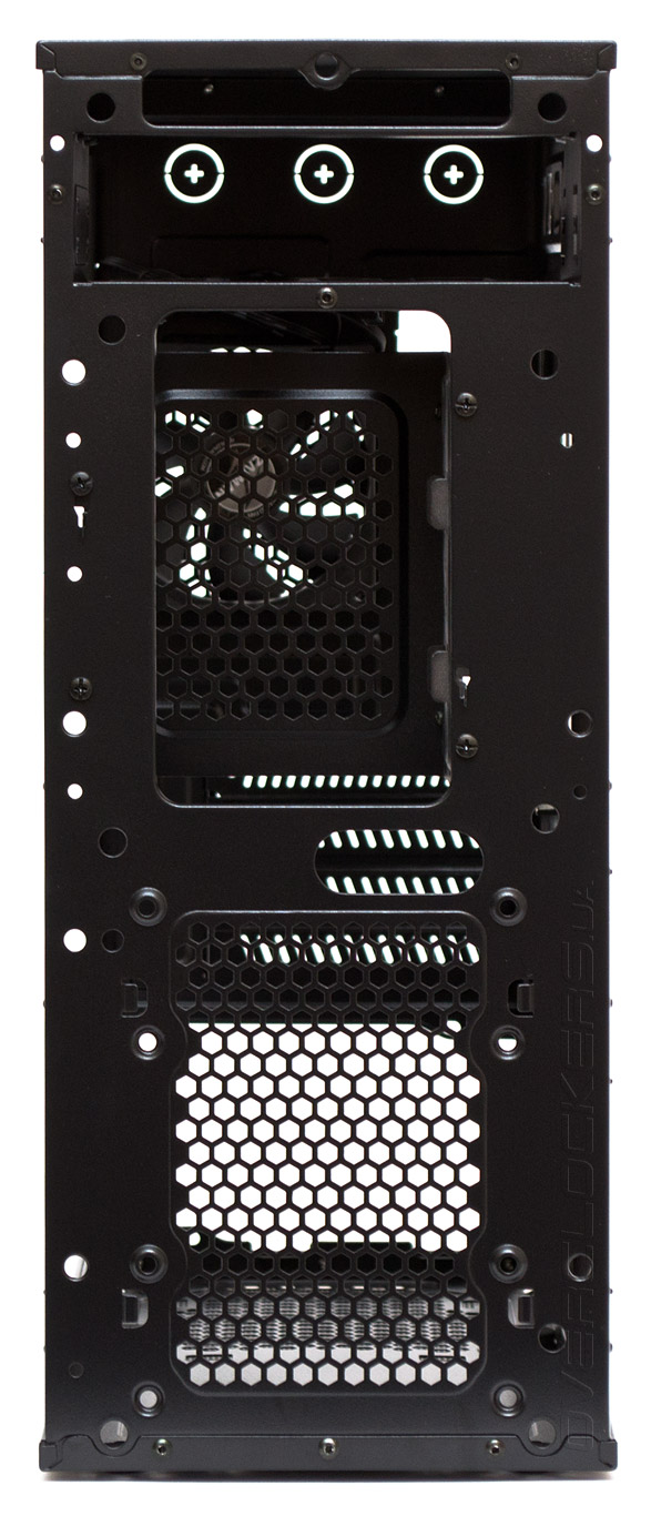 На задней панели предустановлен вытяжной 92-мм вентилятор. Четыре заглушки слотов расширения вентилируемые, причем первая заглушка съемная, а вторая, третья и четвертая — выламываемые одноразовые.