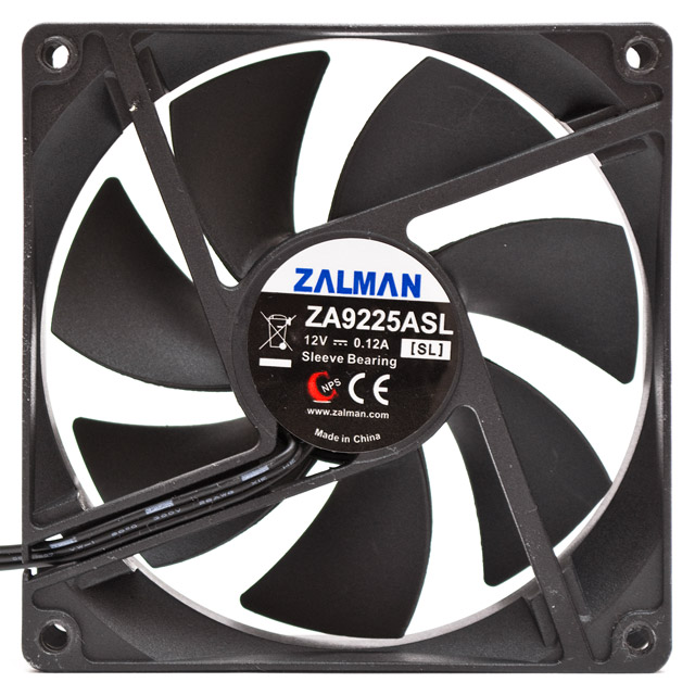 92-мм вентилятор имеет трехконтактный кабель длиной 570 мм. В качестве подшипника используется втулка скольжения. Очевидно, что она неплохо смазана, потому как посторонних призвуков не наблюдается. Крыльчатка стартует с 5 В и 600 об/мин и остается бесшумной до 10 В и 1300 об/мин. Вплоть до максимальной скорости в 1500 об/мин пропеллер остается достаточно тихим.