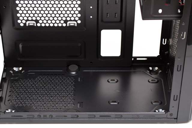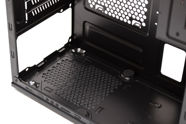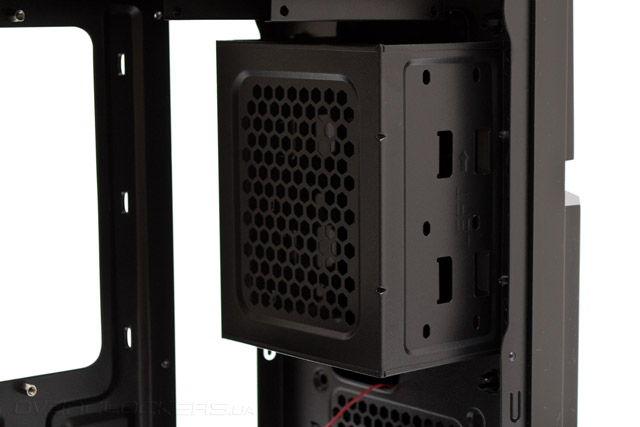Отверстия на посадочном месте блока питания позволяют ориентировать его вентилятором как вверх, так и вниз. Два крупных демпфера на нижней панели должны неплохо гасить вибрации от вентилятора БП.