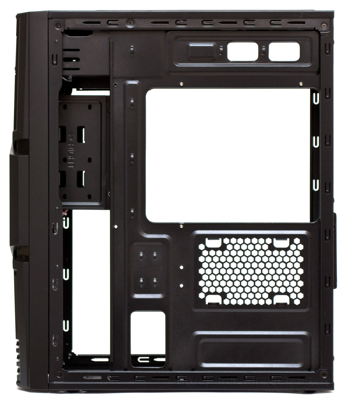 В отличие от ZM-T1 и ZM-T2, чья правая панель была вообще несъемной, ZM-T3 имеет полноценный поддон материнской платы с огромным вырезом под усилительную пластину процессорного кулера. Кроме того, есть десяток проушин для кабельных стяжек, три отверстия для протяжки проводов и посадочное место для третьего по счету накопителя формата 2,5″. Но, следует учитывать, что запас места от поддона до штамповки боковой дверцы не превышает 10 мм и укладывать провода в таком ограниченном пространстве может быть очень непросто.